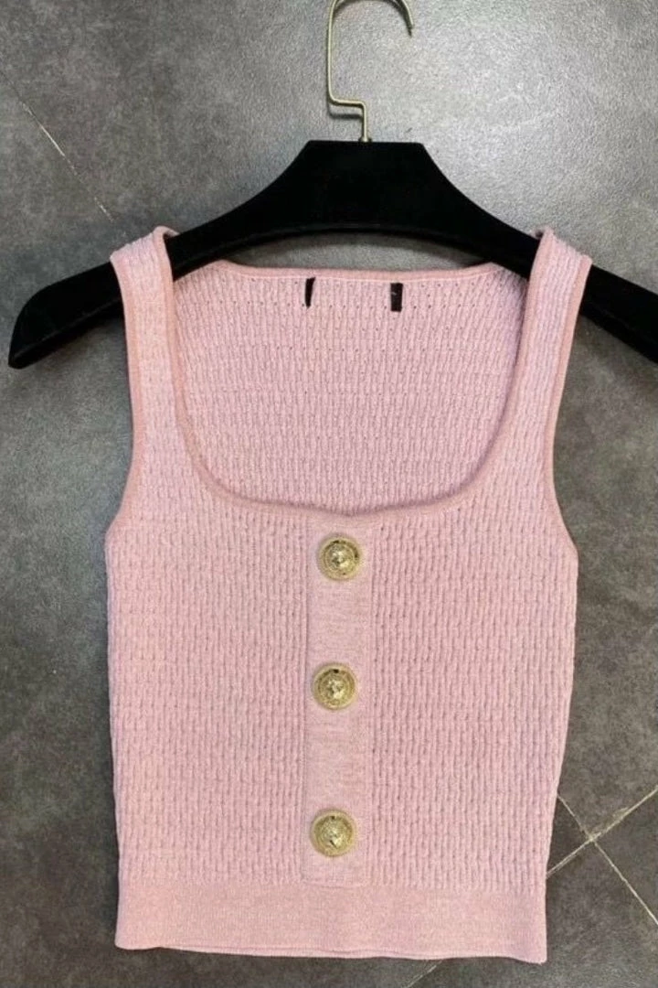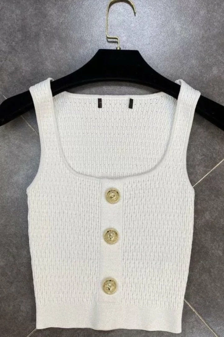 This tank top features three gold buttons and is a knit material. Better than your basic plain tank, pair with your favorite denim shorts for a cute everyday summer look or under your favorite blazer.