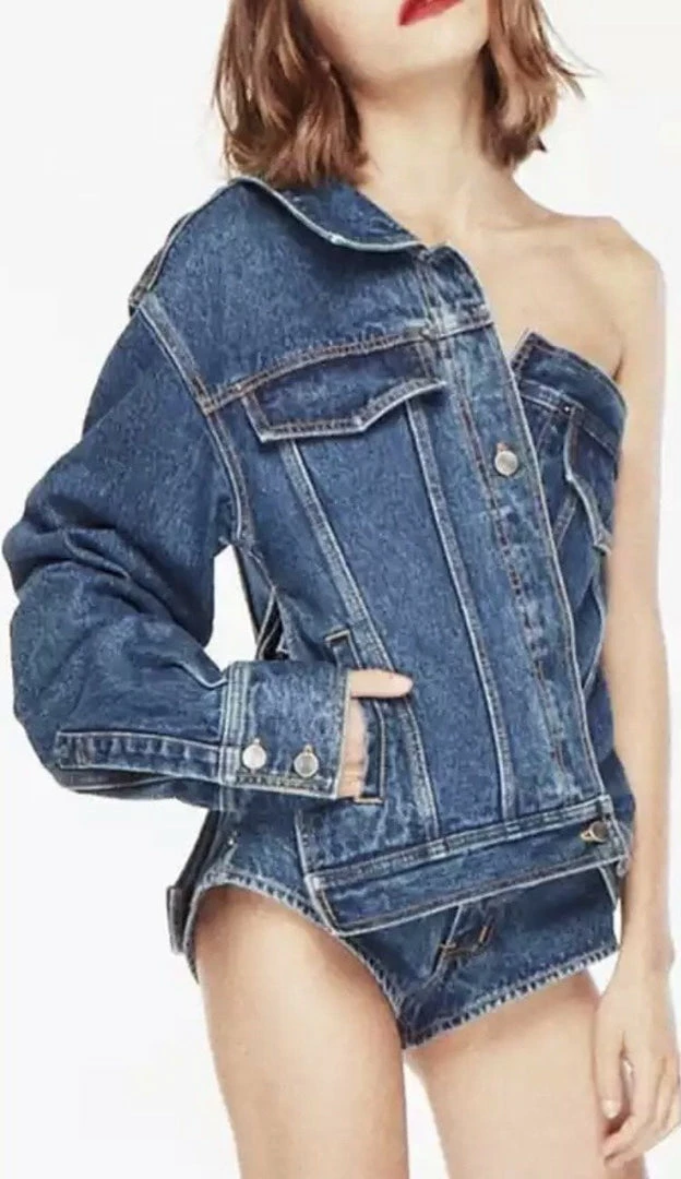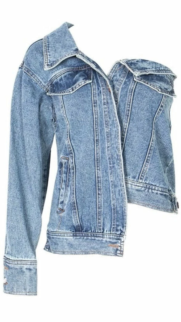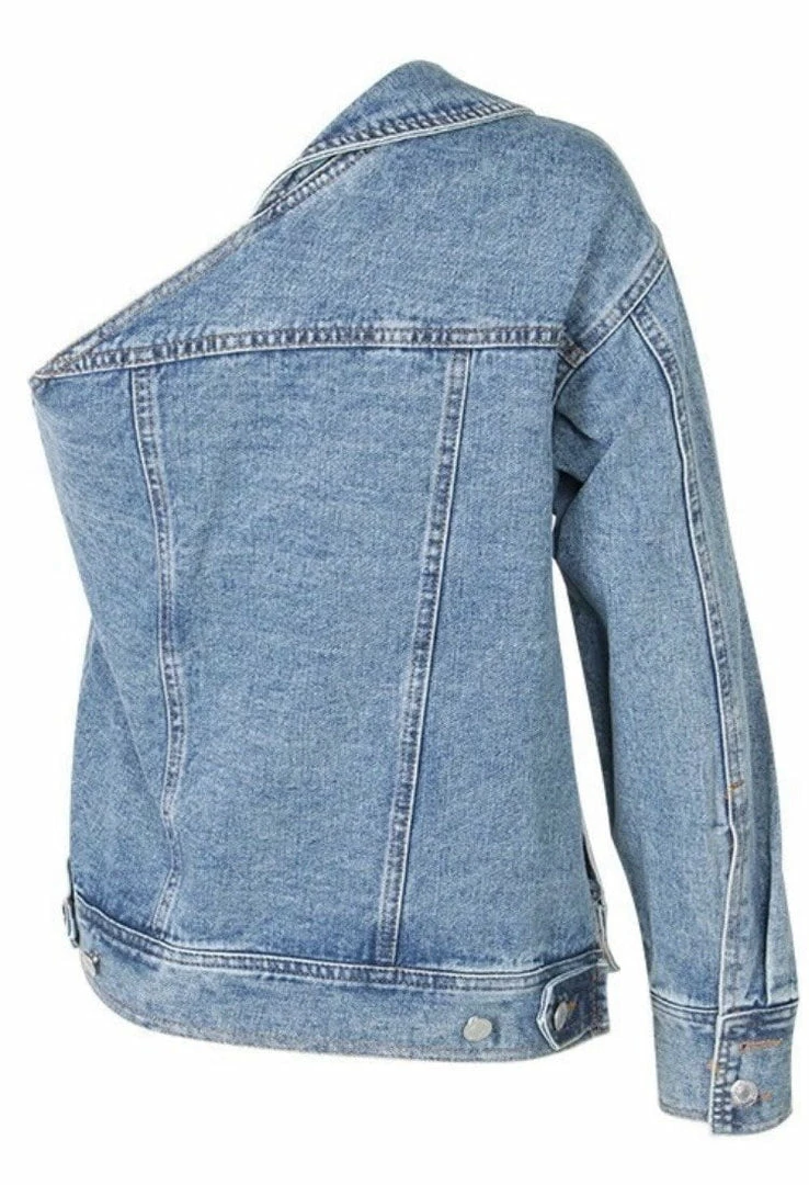 Dare to be different in the ‘Nellie’ denim jacket! Featuring a one shoulder style, silver button embellishments, and pockets. Pair with a cute skirt for a trendy look.