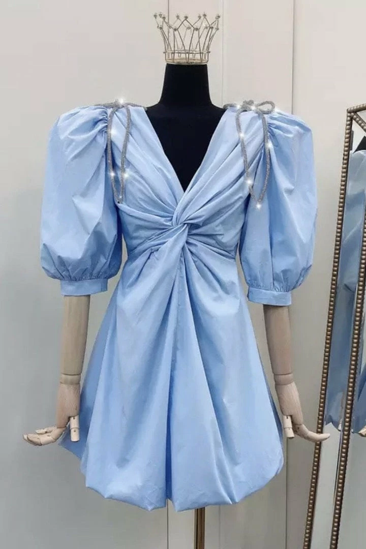The cutest summer dress! This piece features short puff sleeves, rhinestone bow details, zipper closure, and a mini length. Pair with nude heels and a summer glow!
