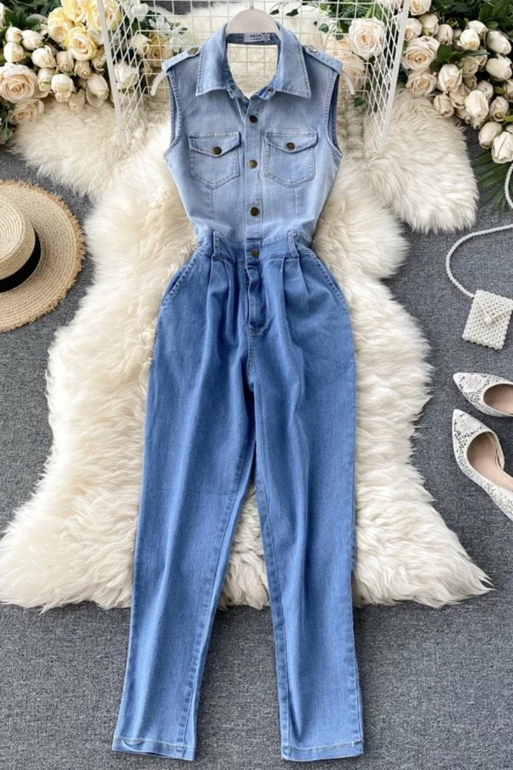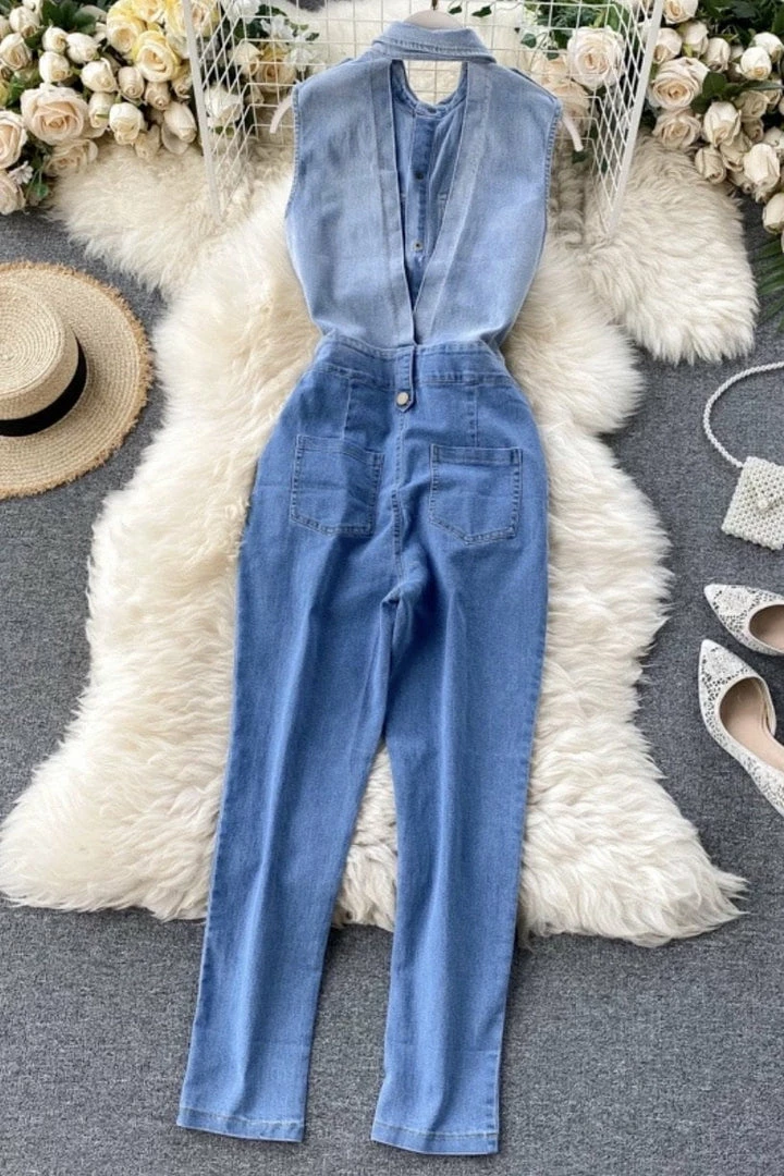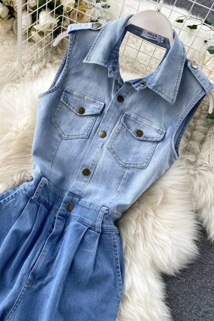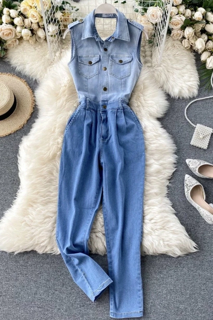 Be the style queen at your next event in this cute jumpsuit! Featuring a denim material, turn down collar, button closure, pockets, and an ombré gradient color. Pair with stilettos and a mini handbag to complete the look.