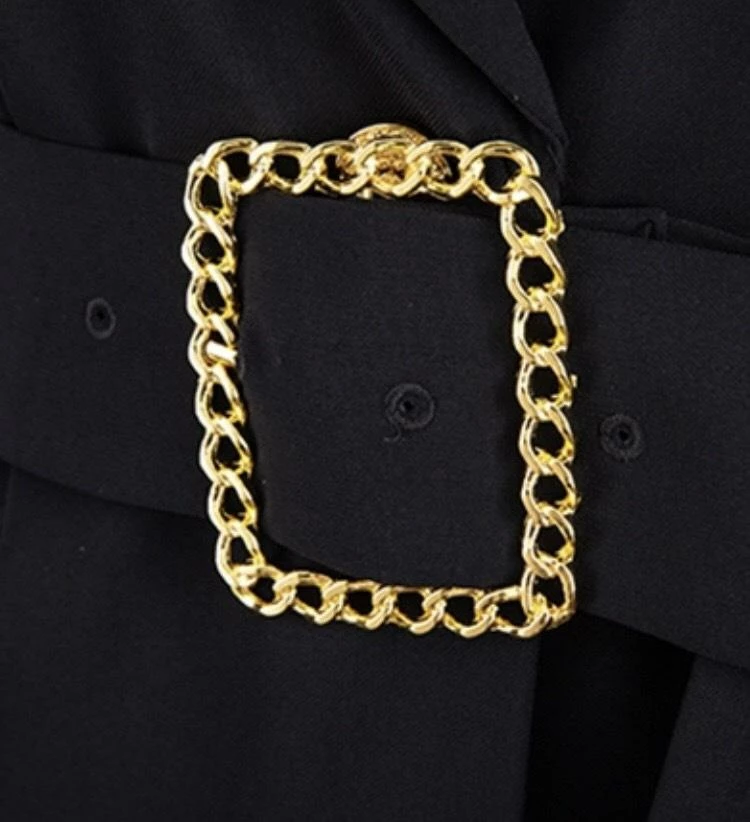 Our sophisticated ‘Nicole’ blazer features a two tone black and nude color, long sleeves, gold button embellishments, and gold belt.
