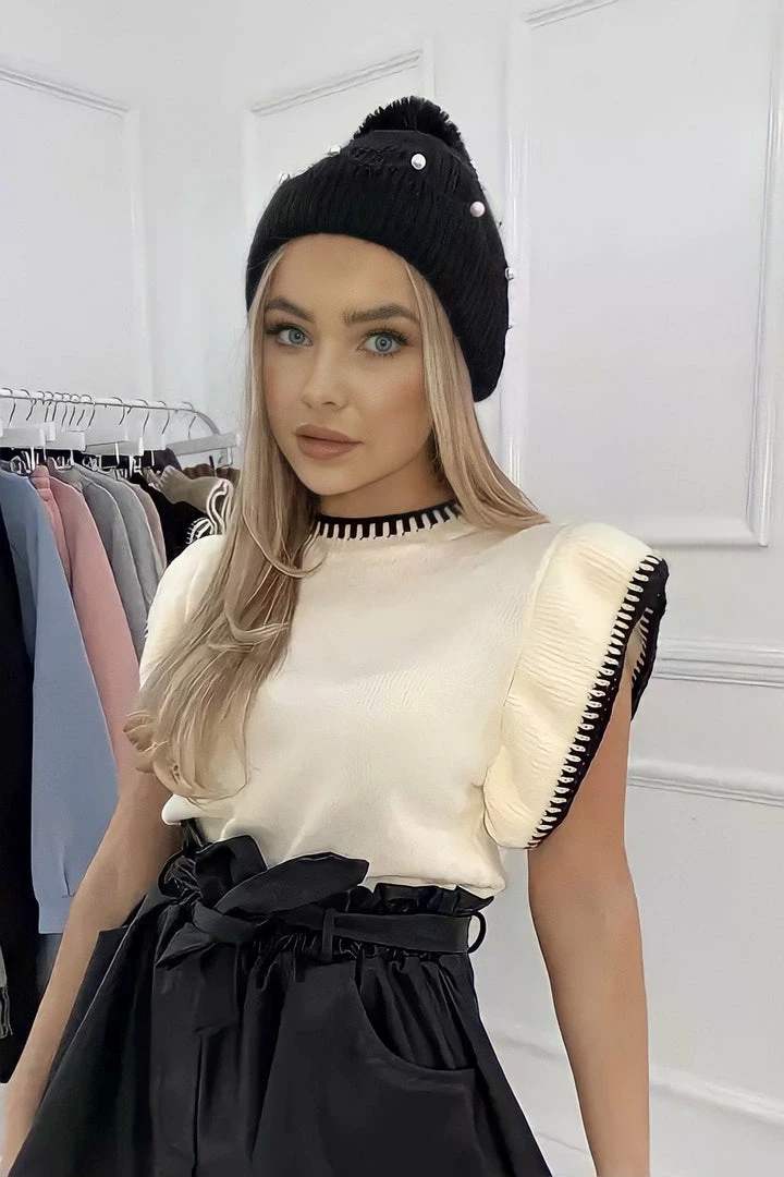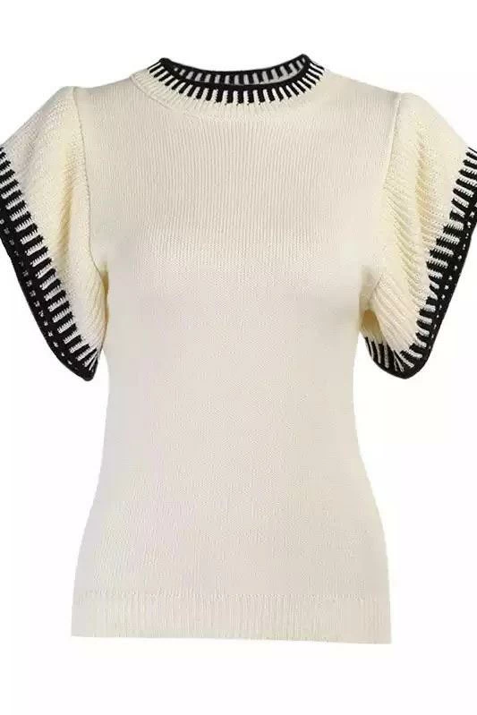 This top is totally chic featuring a knitted material, ruffed sleeves, and color block neckline and sleeve seams. Pair with leather shorts or light washed capri jeans to transform into a total doll!