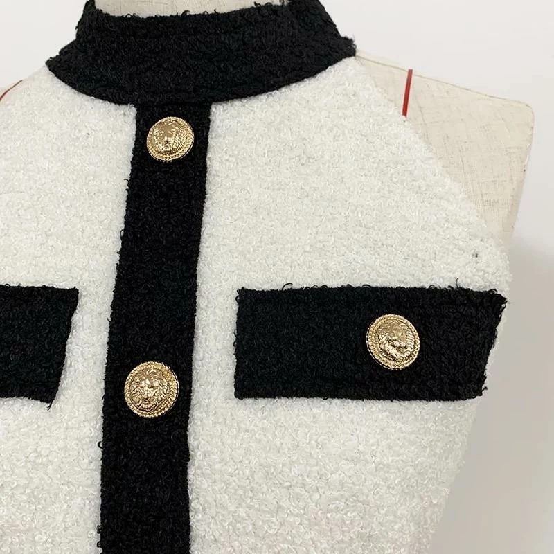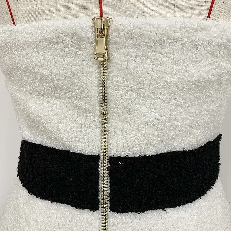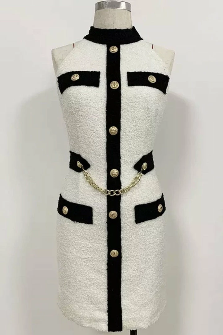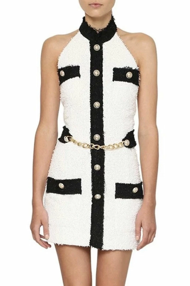 Look ultra luxe in this gorgeous mini! Featuring a black and white material, gold embellishments, chain belt, halter style, and bodycon fit. Pair with gold accessories and pumps to complete the look.