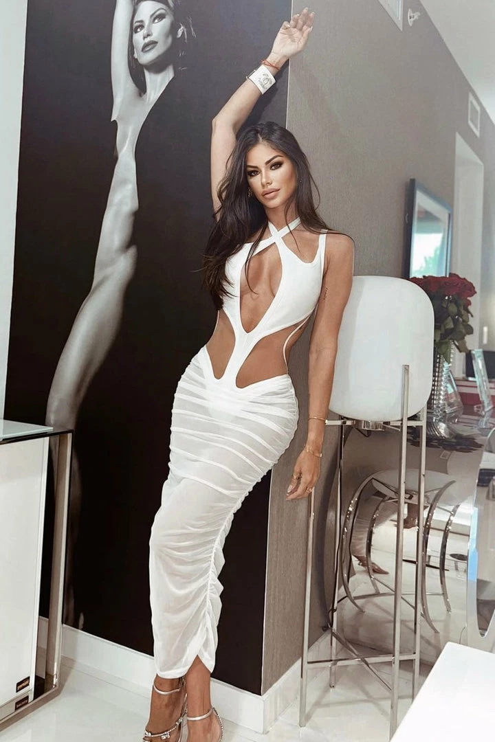 Look like a celebrity in this body accentuating fantasy fit! This midi dress features cut out detailing on the torso, chest, and shoulders, a mesh ruched skirt, and a underliner like a bodysuit. Whether it’s with pumps and a leather jacket for a night at the club or worn as lingerie for a special someone, we’re absolutely loving it!