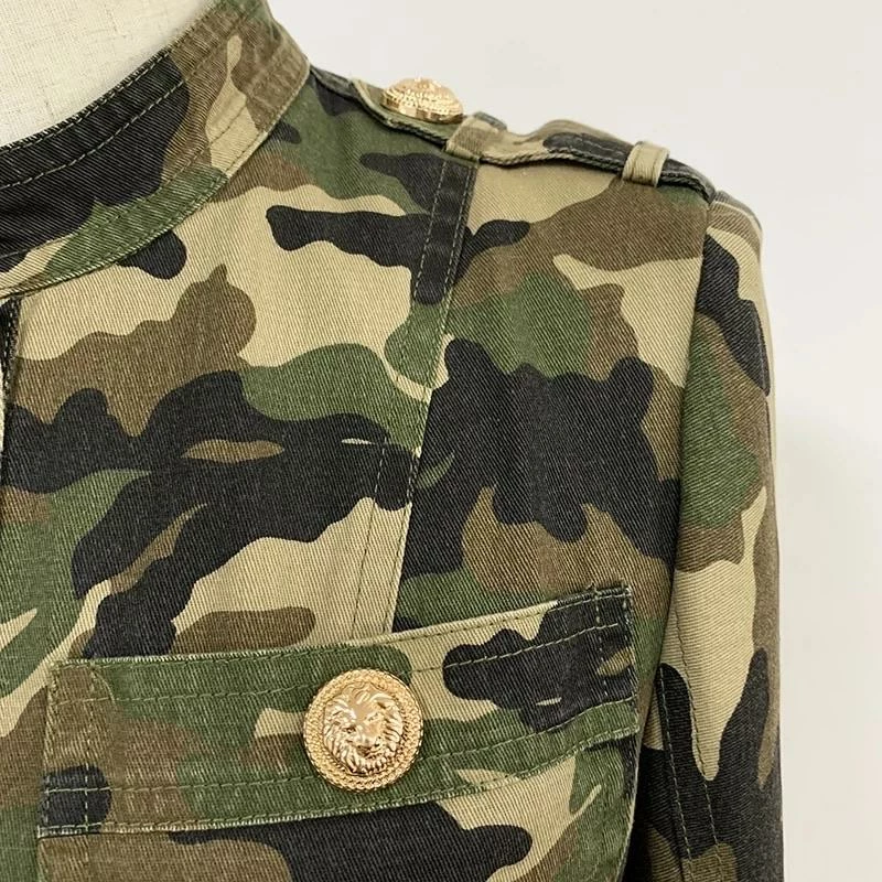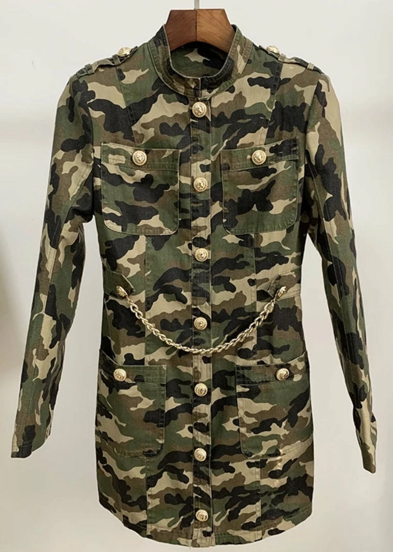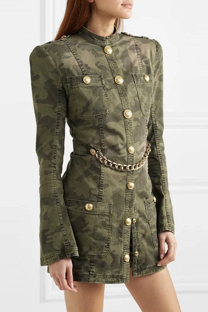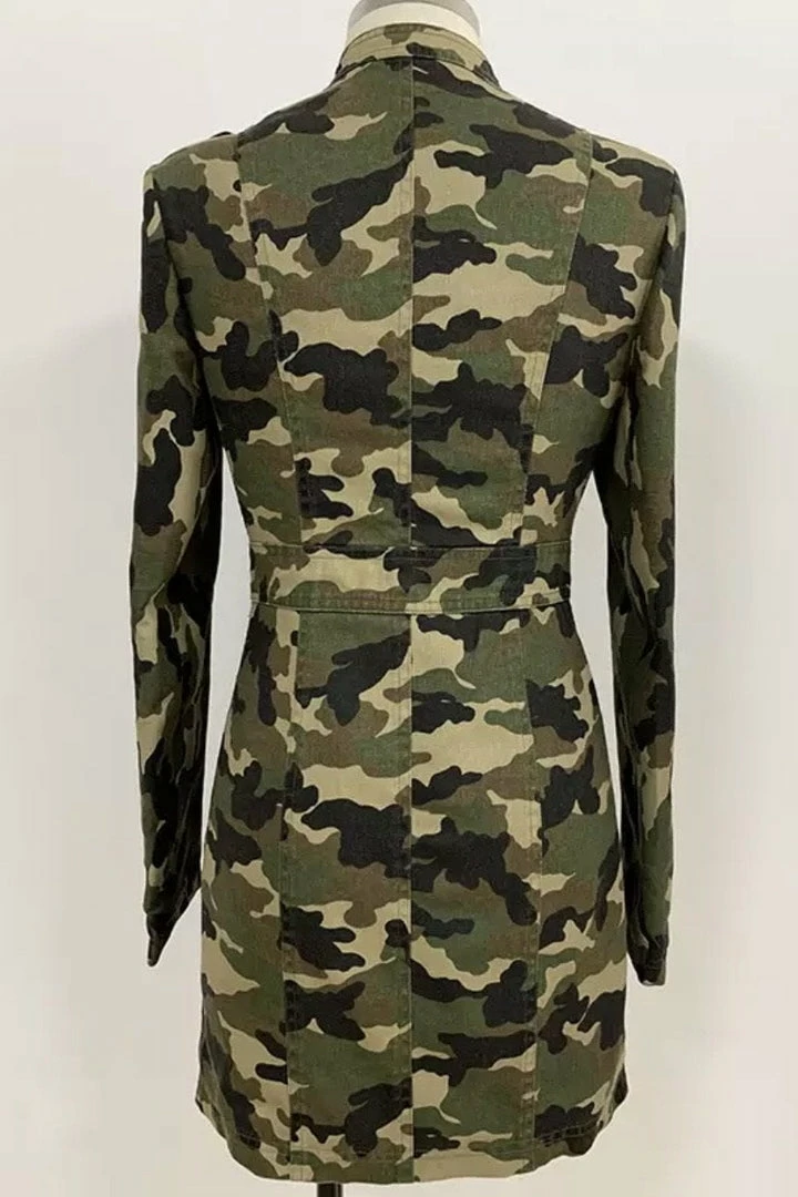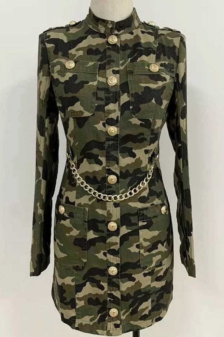 Nail all of the trends in this cute mini! Featuring a camo print material, long sleeves, gold button embellishments, gold belt, bodycon fit, and mini length.