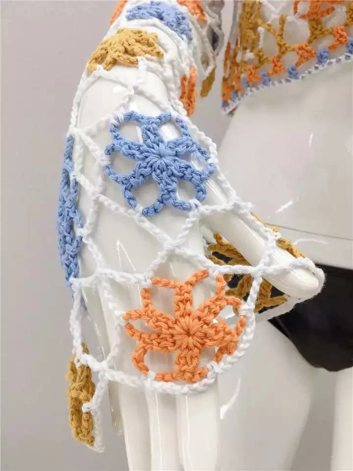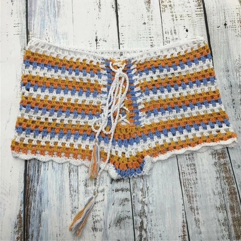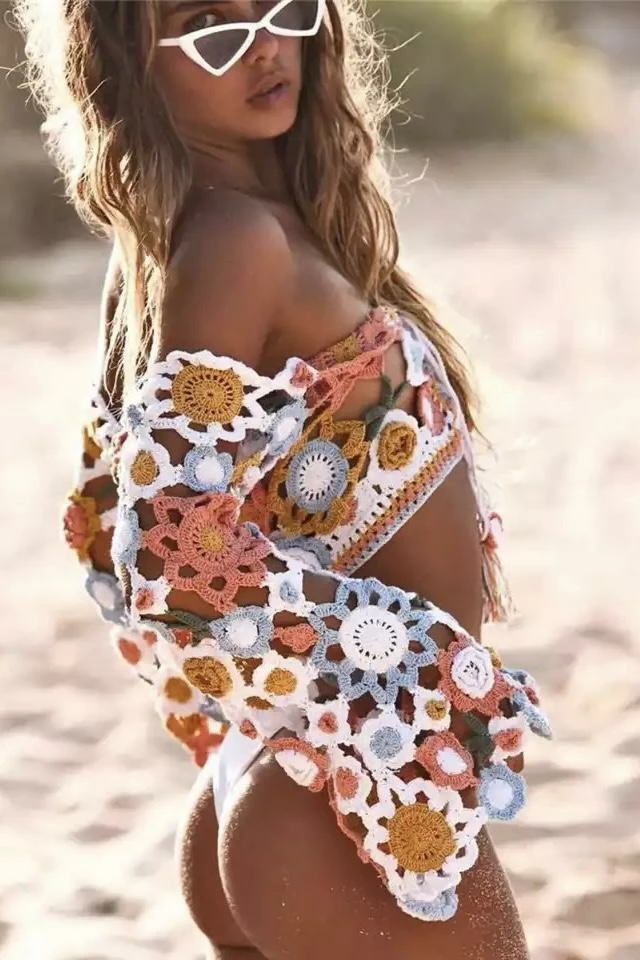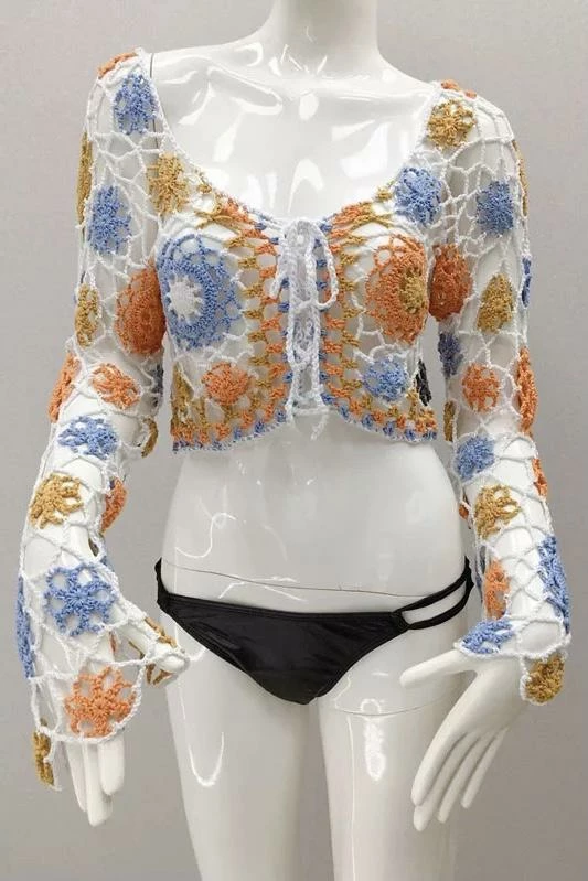 Feel the ocean breeze in this stunning hand made, crotchet long sleeve crop top with a sting lace up center and flower designs. Set also includes matching high rise multicolor booty shorts. How this set on over a little bikini with big sunglasses for the cutest beach look!