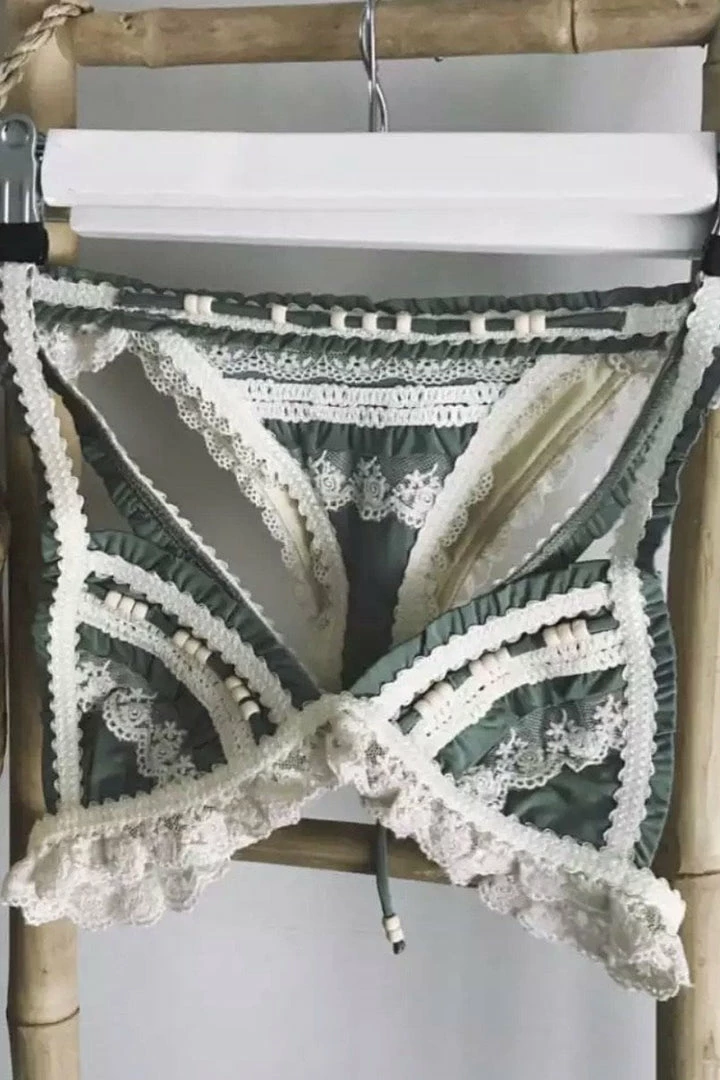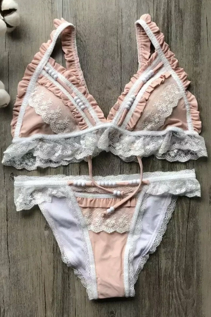 Look extra dreamy poolside this season in this set! Featuring lace, beaded, and ruffle details all over with a triangle top and matching bottoms.