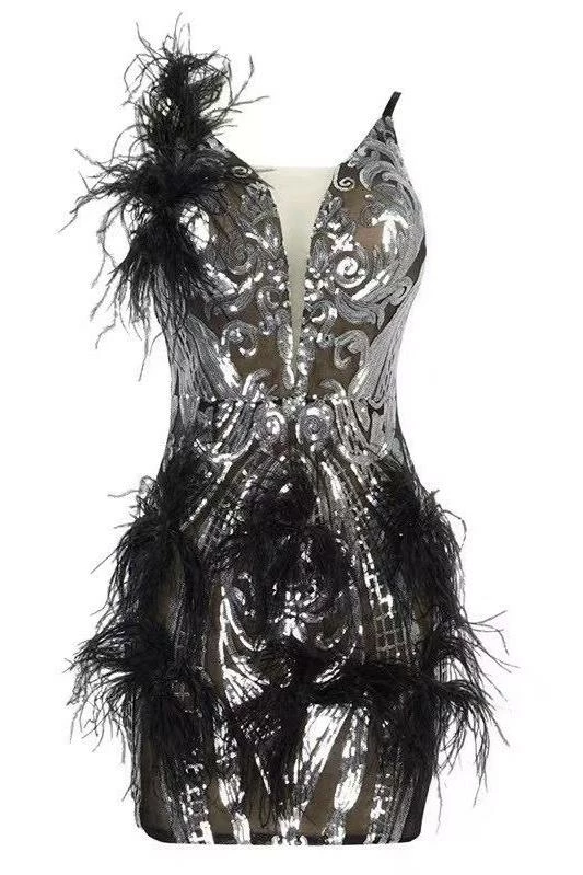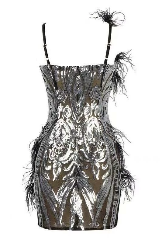 Stand out this season in this stunning mini dress. Featuring thin straps, a mesh plunging v neck, and sequin and feather designs throughout. Pair with black sleek pumps and a simple clutch to let the dress do the talking!