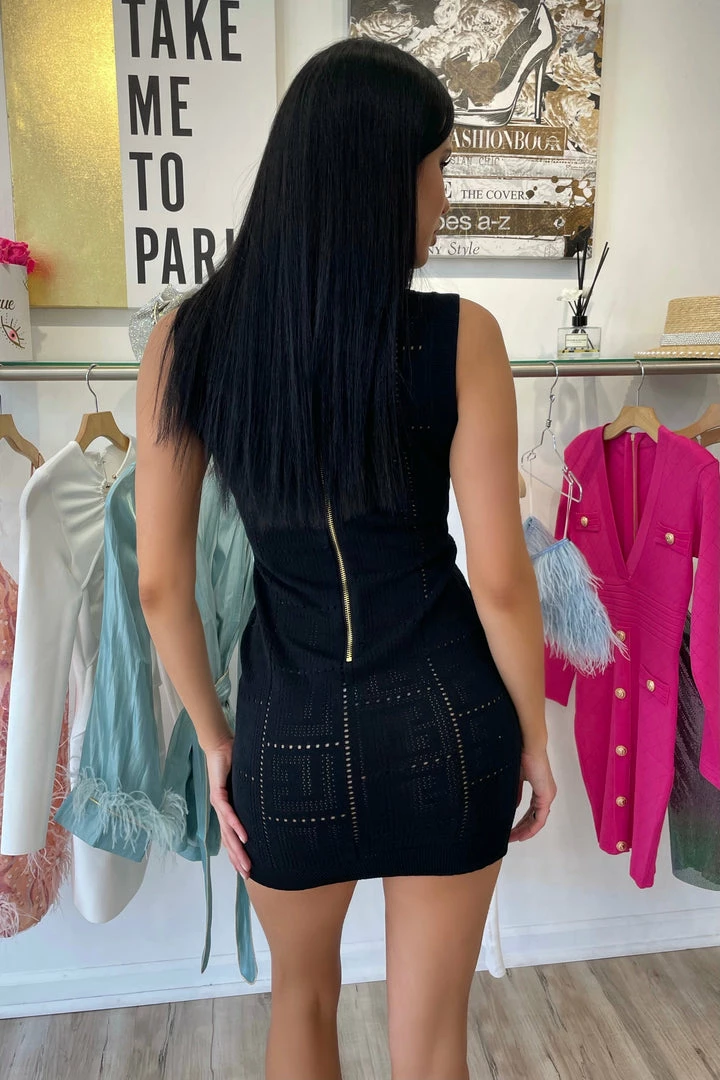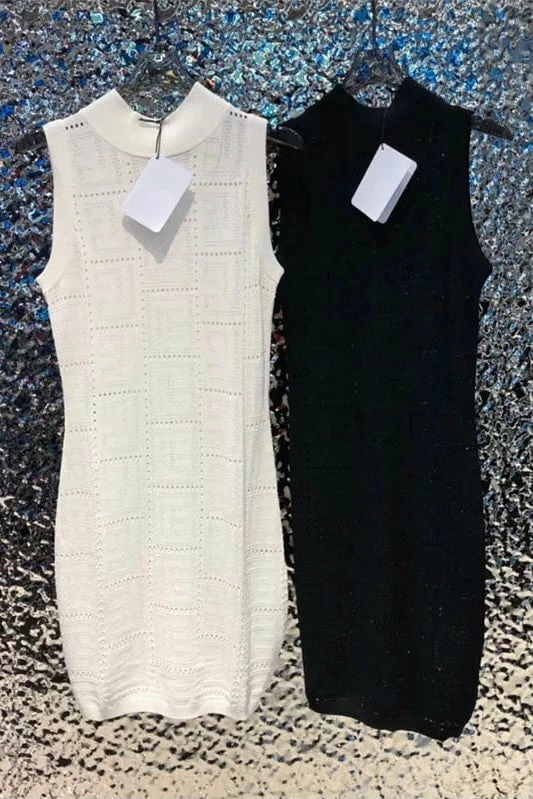 This simple tank dress can follow you everywhere. Featuring a sleeveless mini dress with a high neck, bodycon knit material, and swirl designs thorughout. Style with sneakers and sunnies for an everyday look or pair with pumps and a leather jacket to hit the bars!
