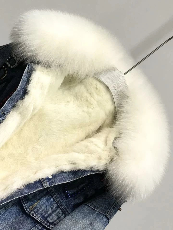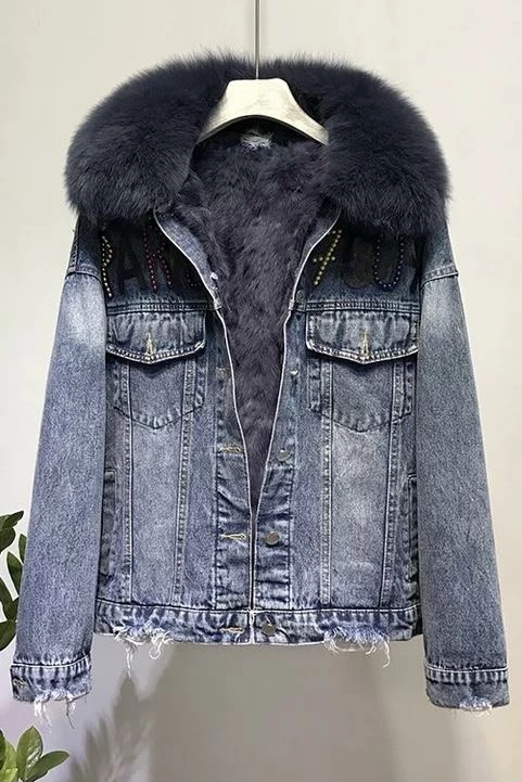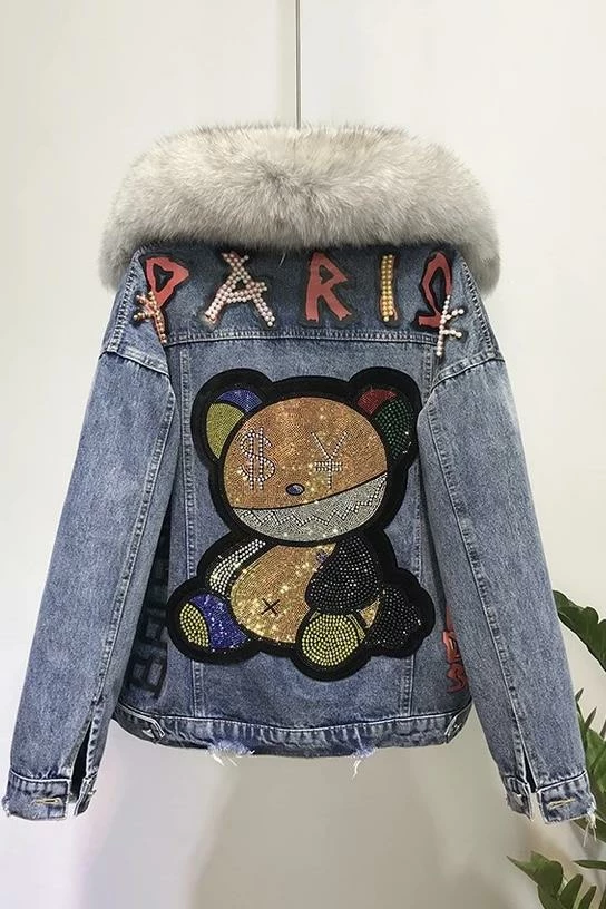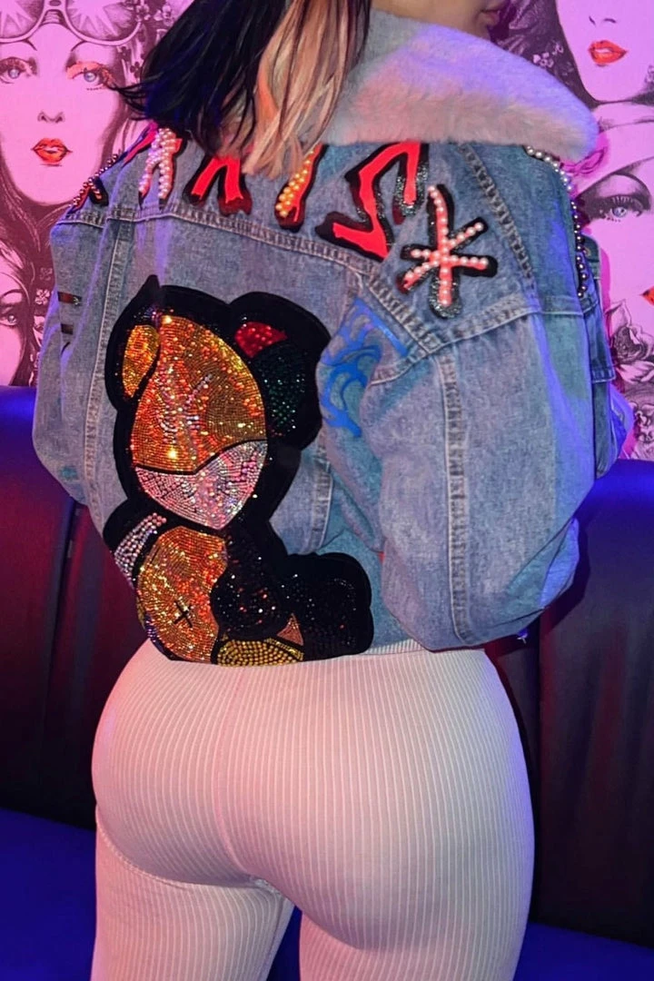 Keep warm and trendy at the clubs this season. Featuring a dark wash denim jacket, four pockets, a rhinestone teddybear and “Paris” dazzled on the back, and rhinestone spelling on the front. The fur lining on the inside is detachable and can be turned into a regular denim jacket. Throw this over any party outfit for a nightlife look we love.