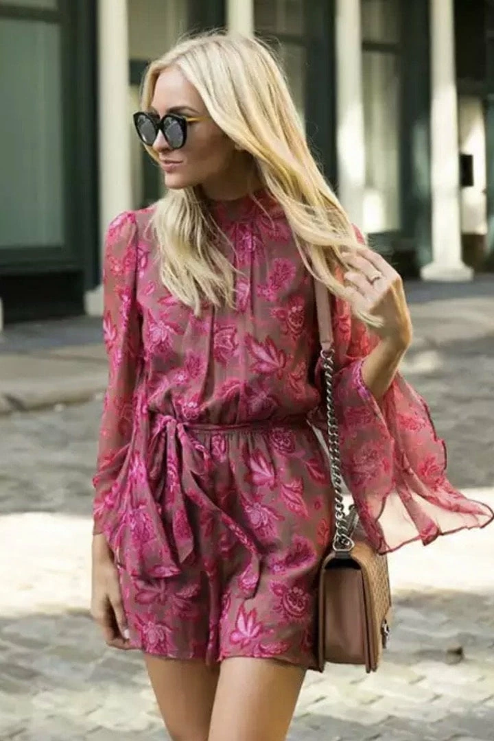 Be the absolute style queen in this stunning piece. Featuring a romper style, floral material, long sleeves, open back, and belted waist. Pair with nude heels and a mini handbag to complete the look.