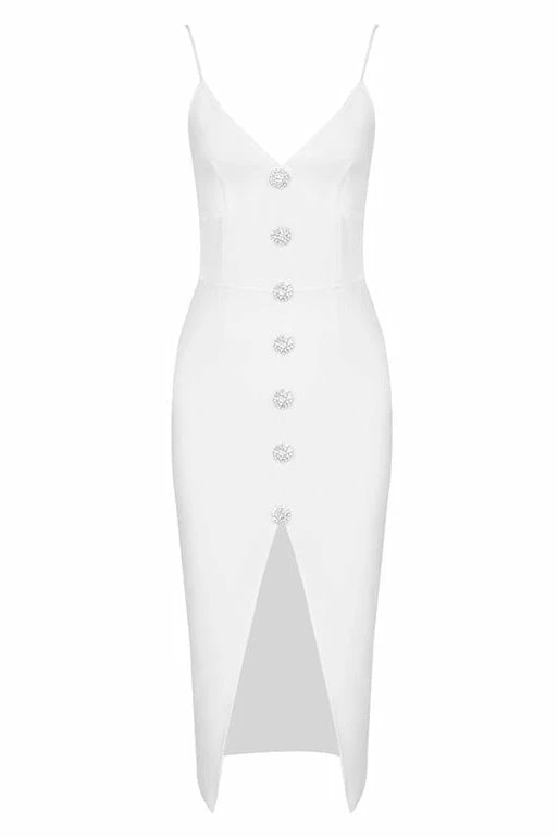 We found the perfect dress for your next all-white occasion! Featuring a low cut dress with silver buttons, a front leg slit, and a strappy back. Style with silver accessories and a sparkle bag for a complete look!