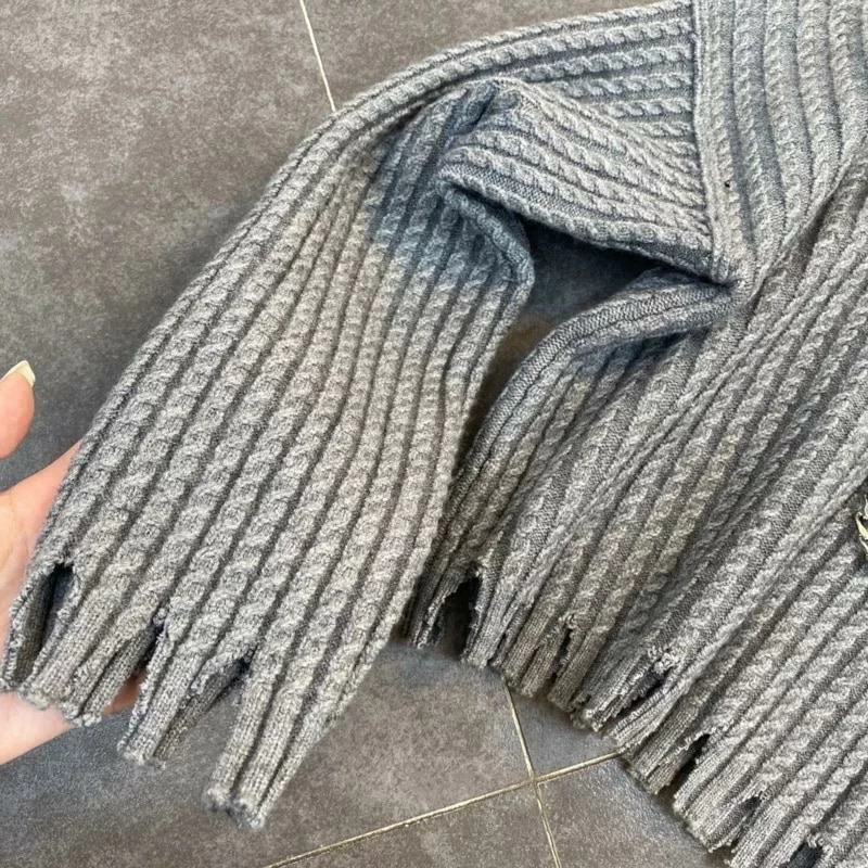This sweater is a must-have for your new season wardrobe. Featuring a cable-knit material with long sleeves, cropped design, chain detail, and distressed trim. Wear with cargo pants, heeled boots and a trench coat for a look we are loving.