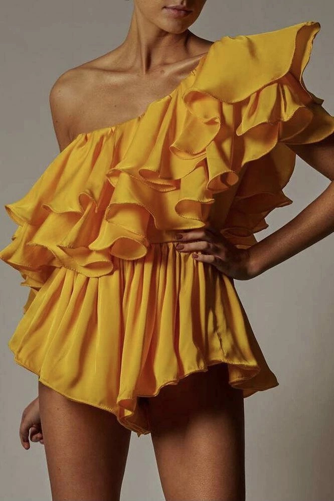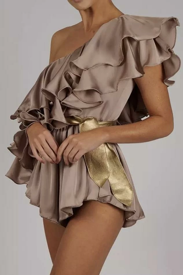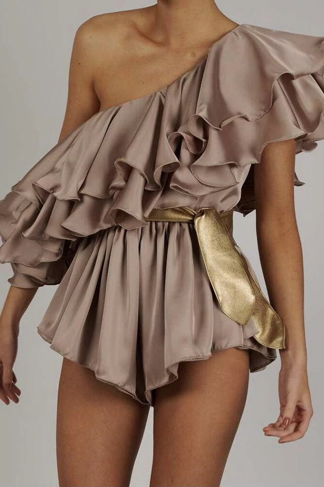 Romp into fall with this adorably elegant one shoulder romper with a ruffle design. Pair with boots or ankle strap heels and a clutch for a unforgettable look at your next event.