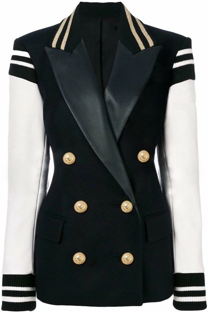 Reach this season’s fashion goals in our ‘Poppy’ varsity blazer! Including a black and white color, vegan leather collar, vegan leather sleeves, varsity design, and double breasted style.