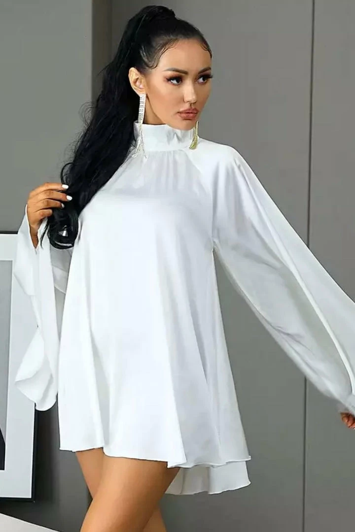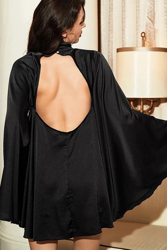 Twirl into this mini featuring long, wide sleeves, a high neck, an opened back, and a silk material. Pair with leather knee high boots and a black cross body bag with a ponytail for a combo we can’t get over!