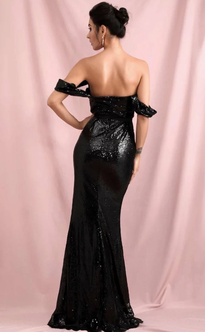 Add some sparkle to you look with this stunning gown. Featuring an off the shoulder style, sequin material, leg slit, and floor length. Pair with barely there heels and a high pony for extra drama.