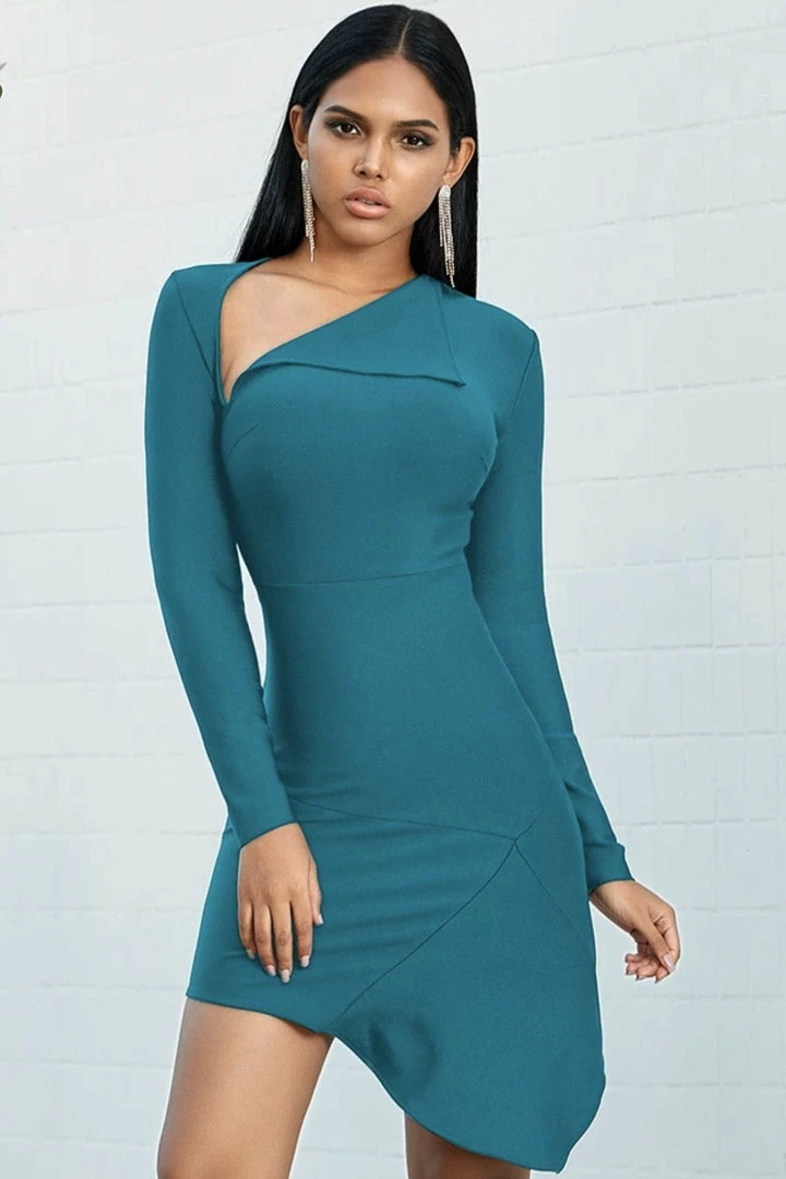 Look super sexy and sleek in this stunning mini! Featuring a bandage material, bodycon fit, long sleeves, cut out on the neckline, and asymmetrical length. Pair with strappy heels and a high pony.