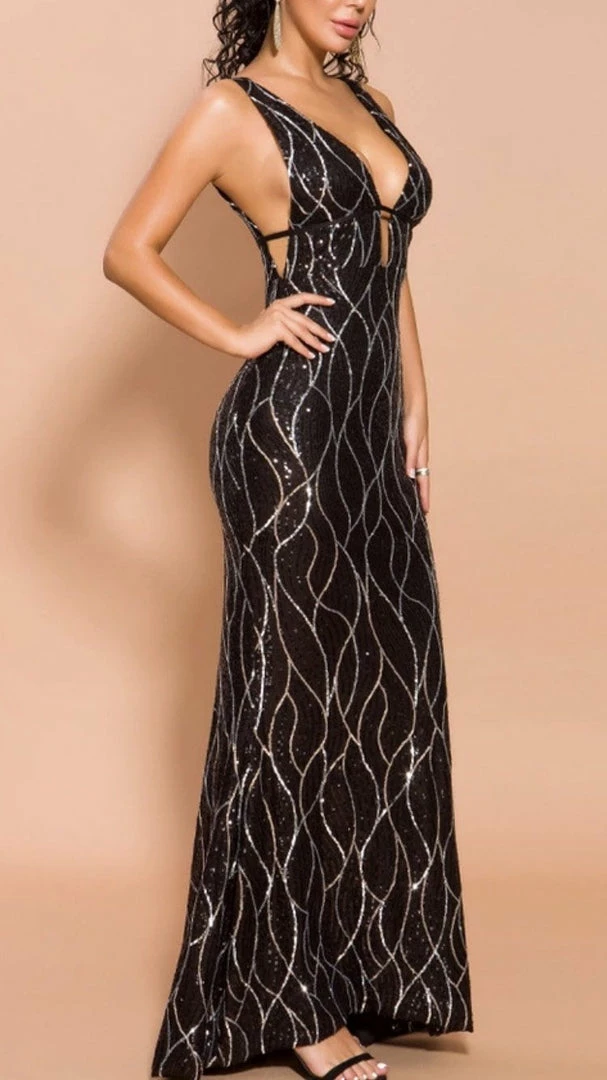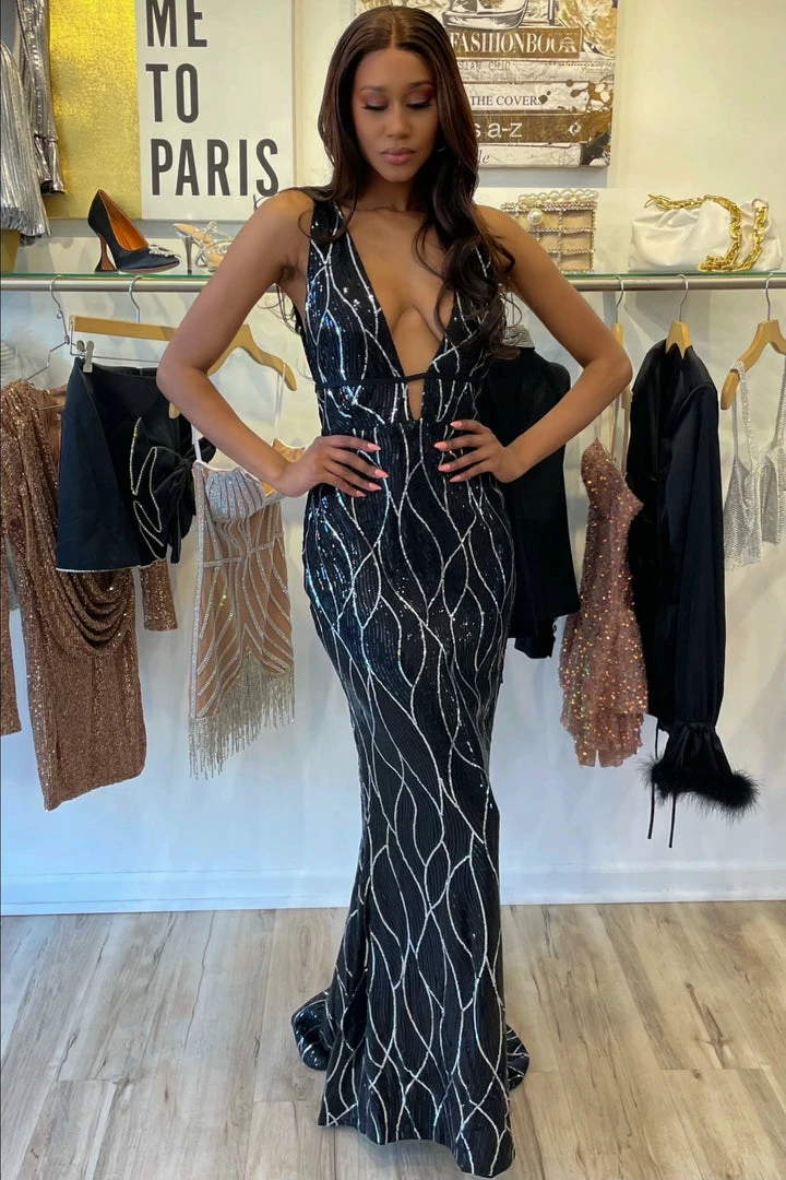 Sparkle all night long in our ‘Remi’ gown. Featuring a deep v-neck, body-hugging fit, floor length style, and embellished rhinestones all over.