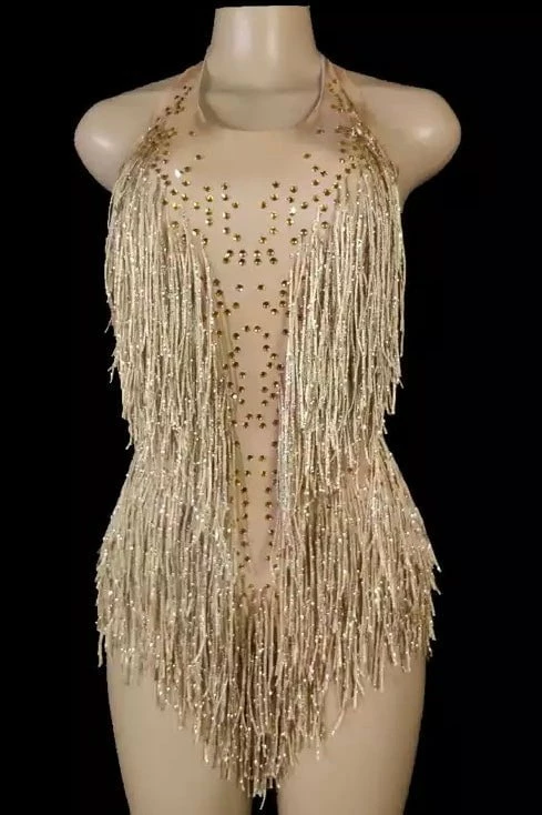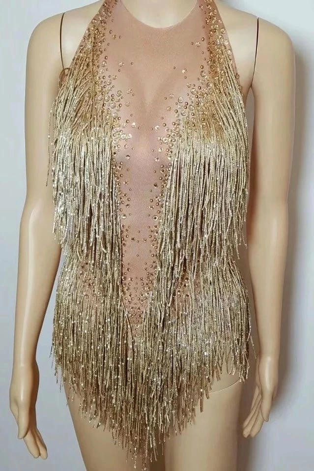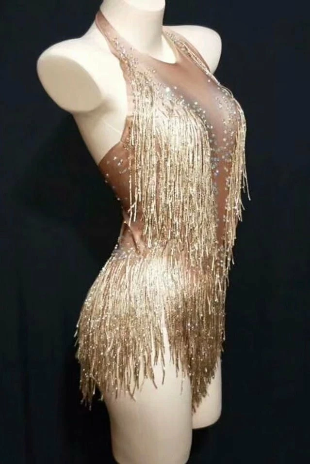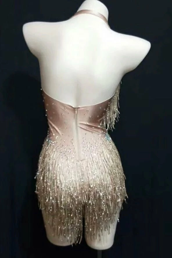 Dance all night long in this gorgeous mini! Featuring a beige material, fringe details all over, halter neck, open back, bodycon fit, and a mini length. Pair with stilettos and a killer clutch.