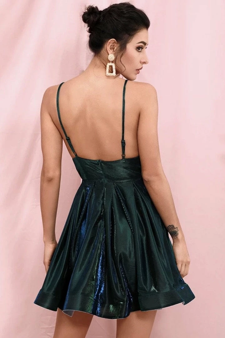 Get the ultimate stand out look with this cute mini! Featuring a reflective material, spaghetti straps, v-neck, and a-line style. Pair with stilettos and statement earrings!