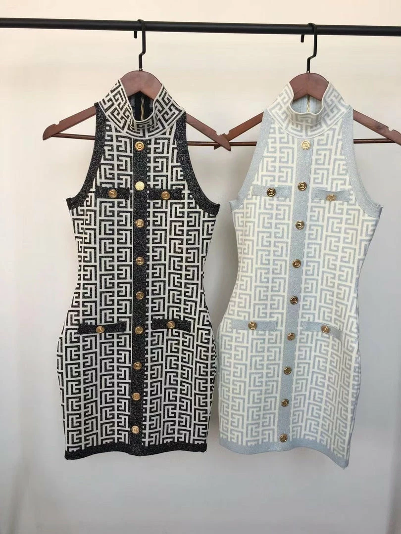 This mini is our style savior. Featuring a bodycon bandage, sleeveless dress with a turtleneck, gold button detailing, and a glittery sheen outline. Pair with gold jewelry and strappy heels for your next dinner date.