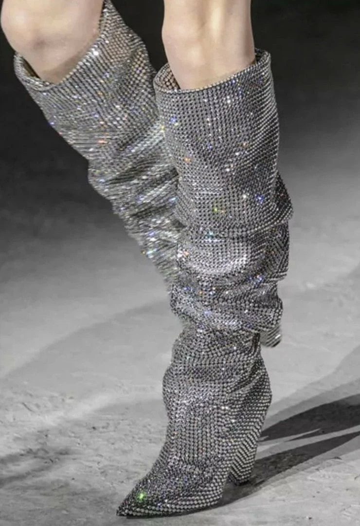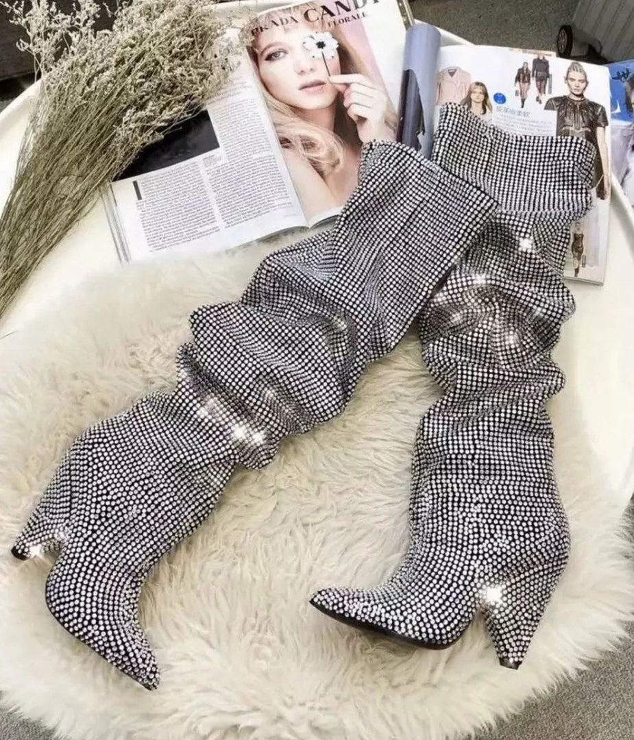 Give your going out look an edge with these chunky heeled boots. Featuring a diamante detail with an over the knee style and a slouch fit. They’re a new season must-have!