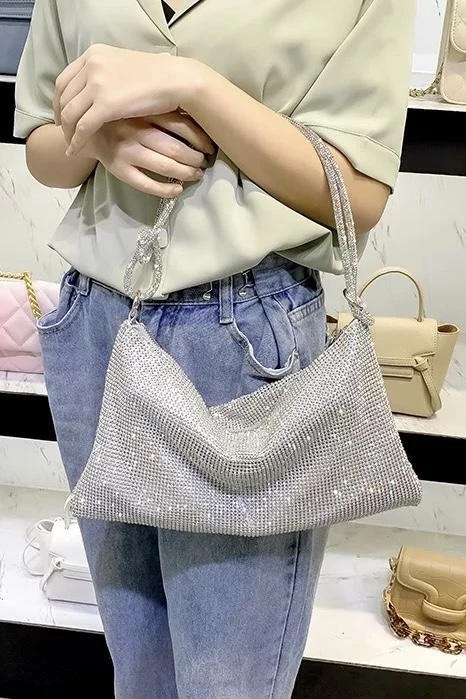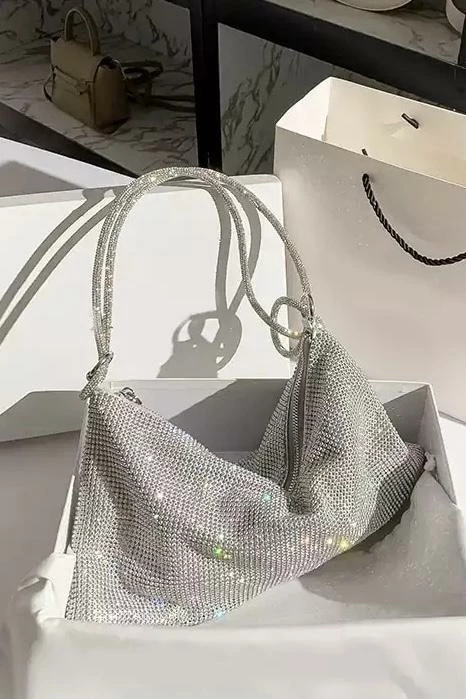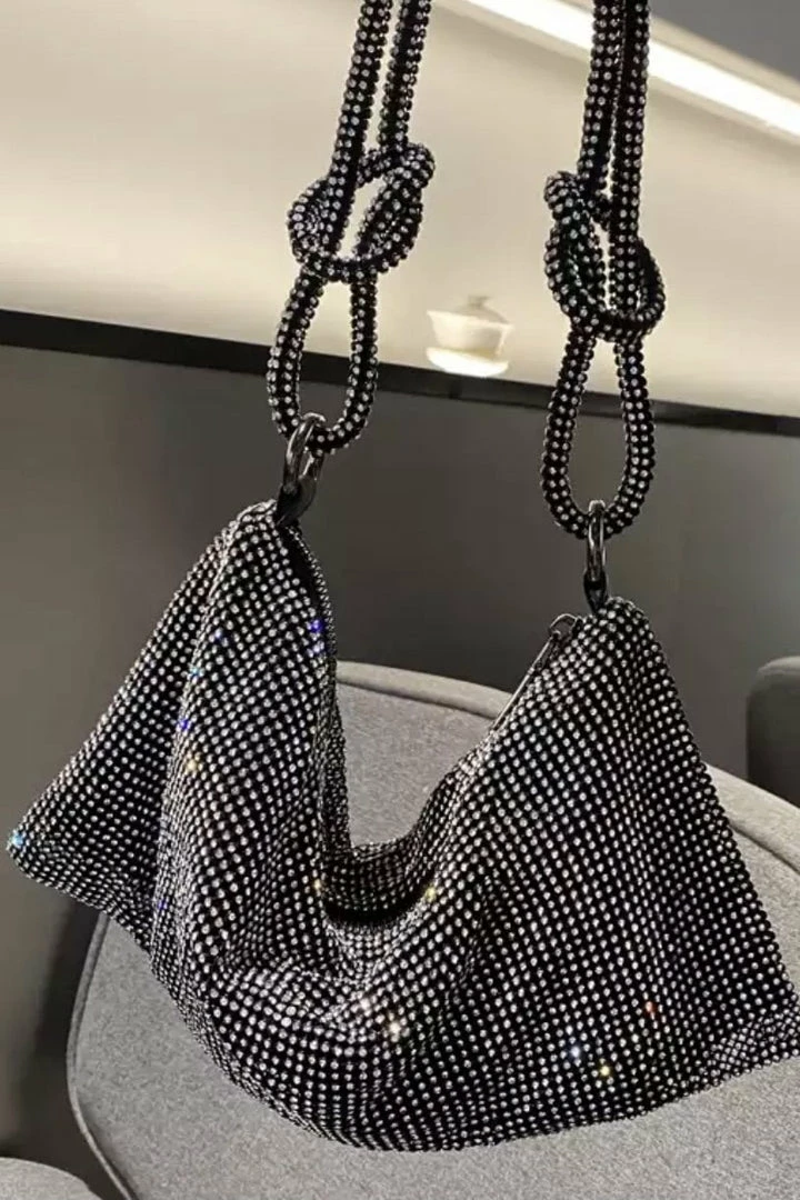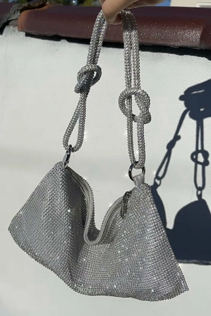 This glitter mini is trending dolls! Featuring a dual, knotted shoulder strap, rhinestone crystals dazzling throughout, and a big pocket with a zipper enclosure. Add this popping purse to dazzle any outfit this season!