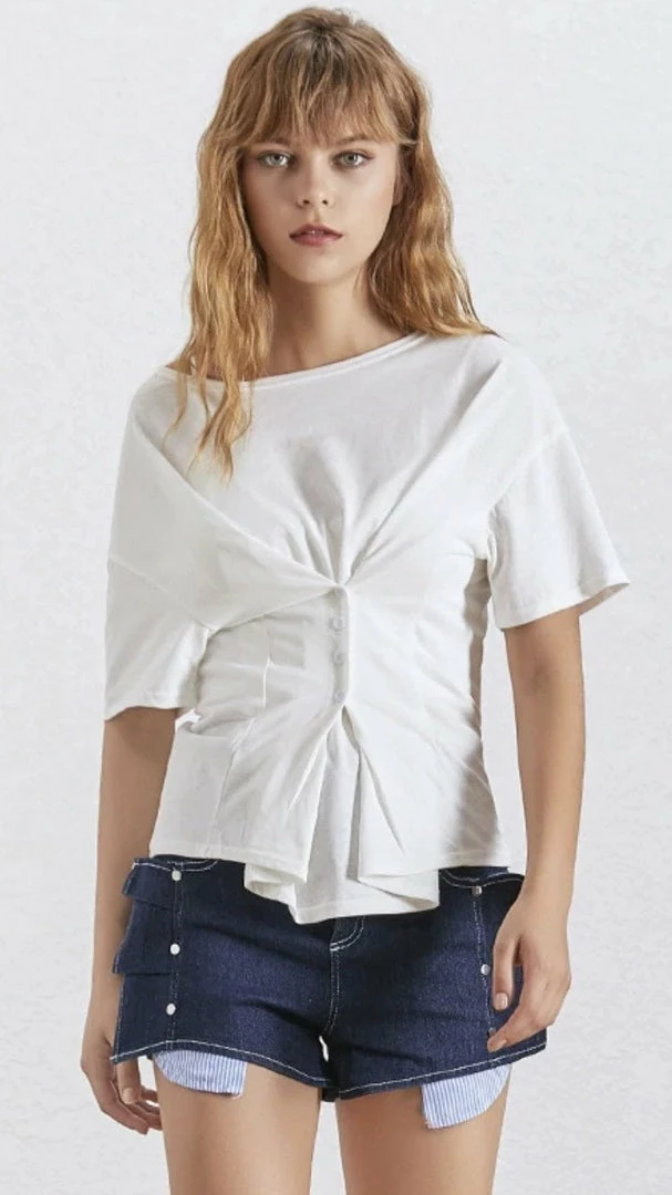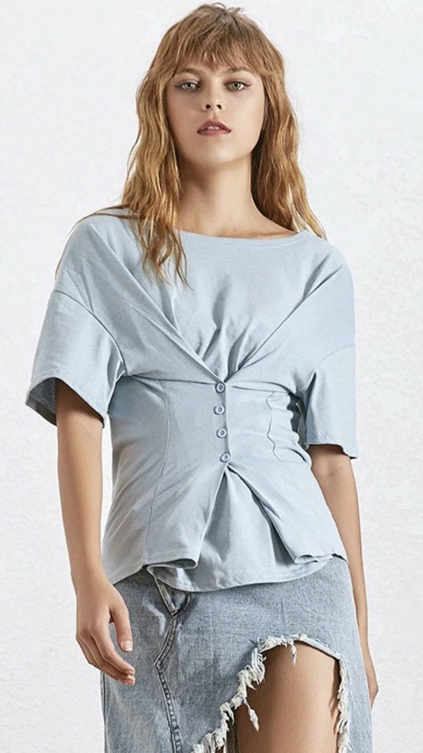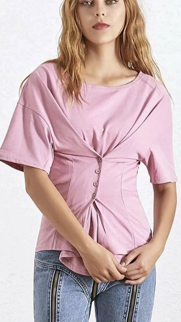 So easy and comfortable to style. This top features buttons, a short sleeve, and cinched in waist. Pair with just about any bottom for a casual look.