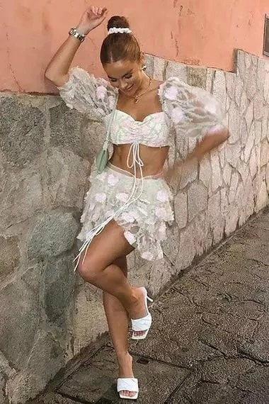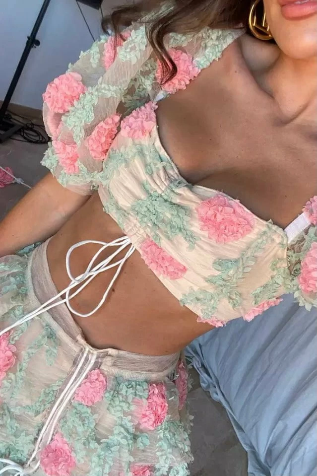 This floral fantasy is perfect for summer dolls. Featuring a puff sleeved crop too with a floral design, mesh material, ruched elastic along the midcenter, tied back, and a matching high waisted skirt with ruffles. Pair with toe thong heels and a mini bag for dinner by the sunset.