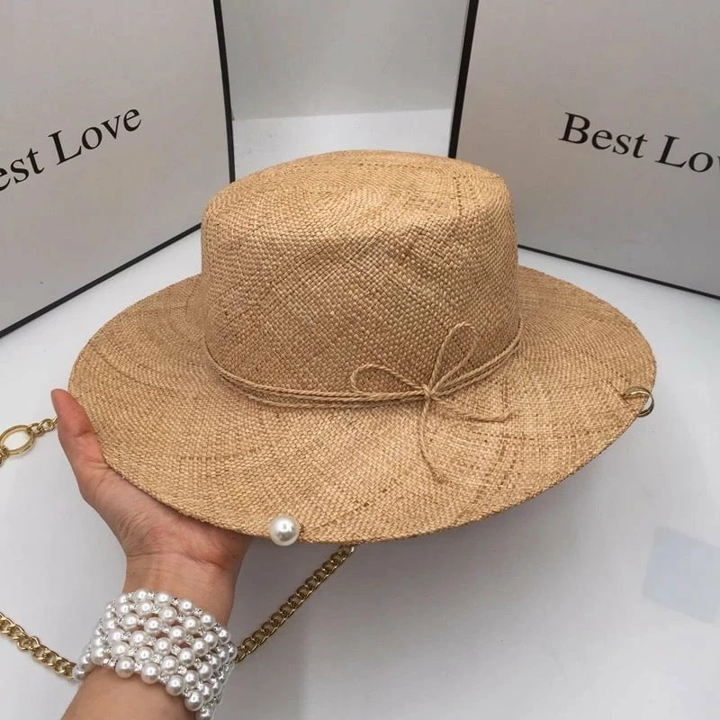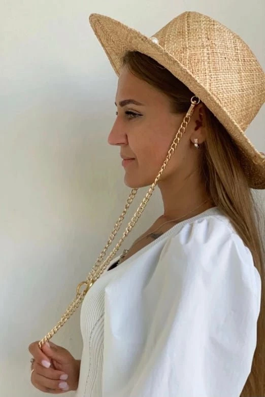 Fight the sun this season with this stylish straw hat! Featuring a short brim straw hat with a gold chain, gold details, and pearl decorations. Head to the beach in a bikini, tote, and this hat to keep your cool this summer.