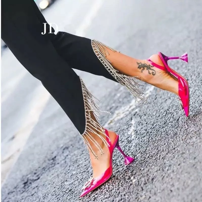 Our stunning and glamorous ‘Sandra’ heels include rhinestones, a clear material, and pointed style. Runs true to size.