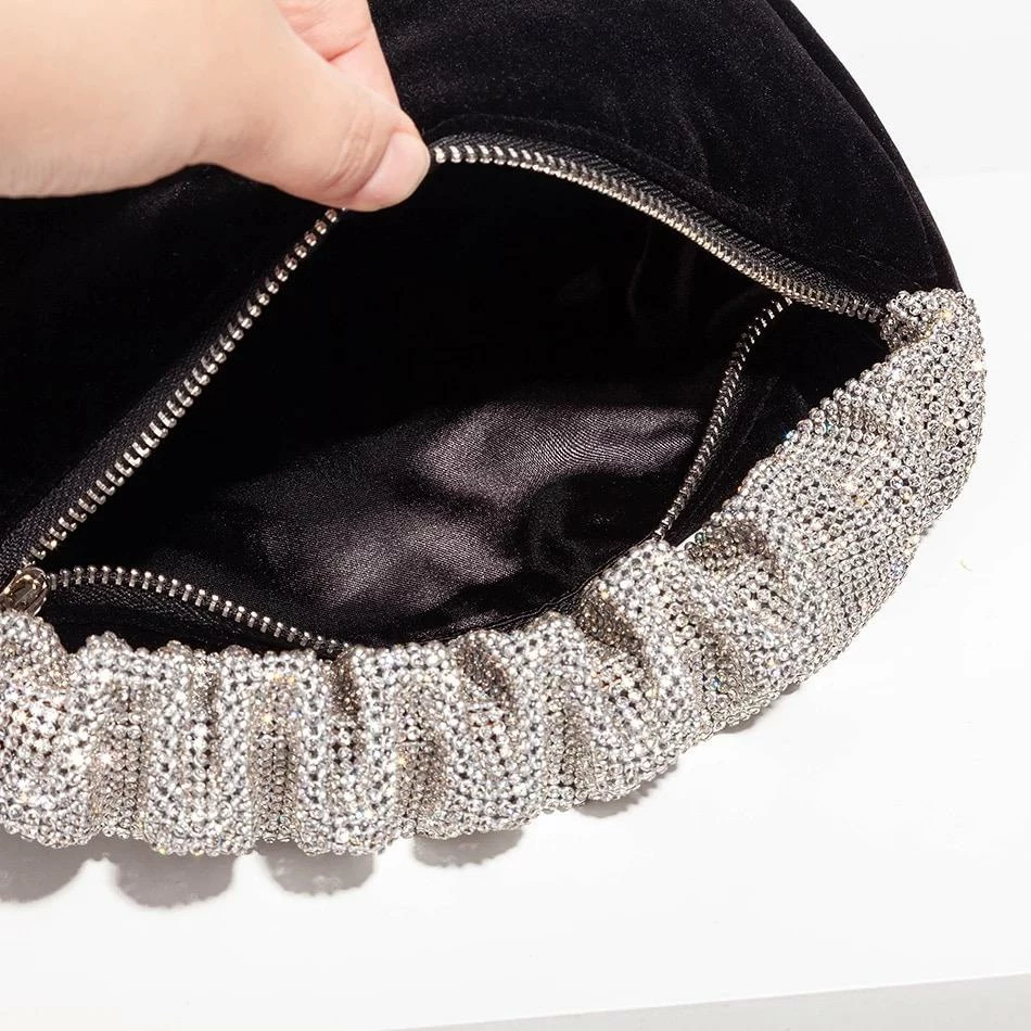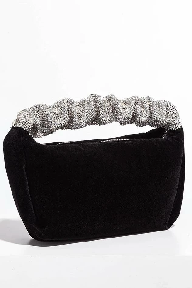 This clutch is the most perfect piece to your purse collection. Featuring a mini bag with velvet material, a ruffled rhinestone decorated strap, and a silver zipper. This is the ultimate going out accessory as it has a big pocket to fit everything you need but still has that mini chic look.