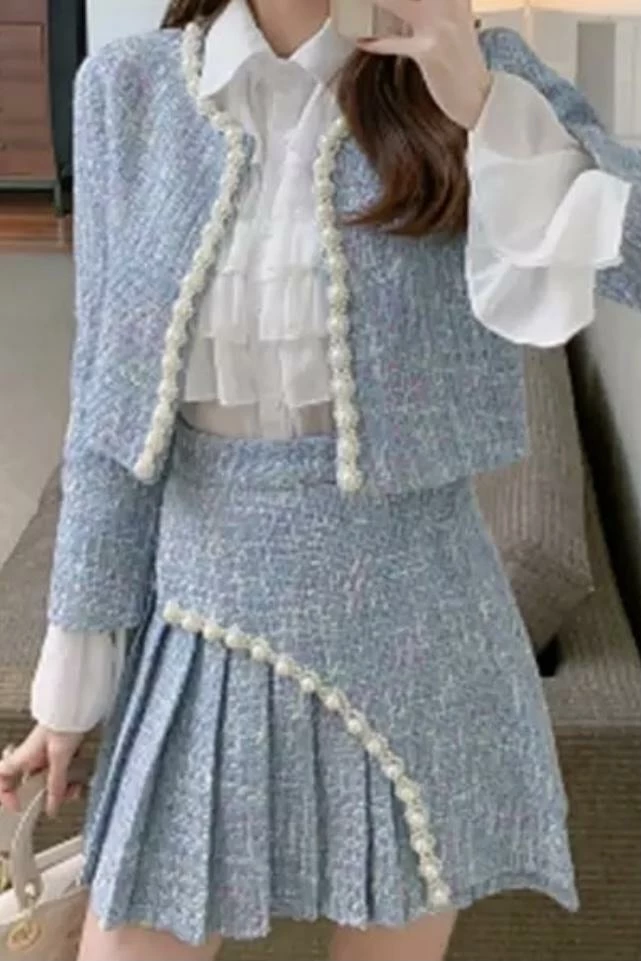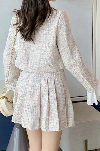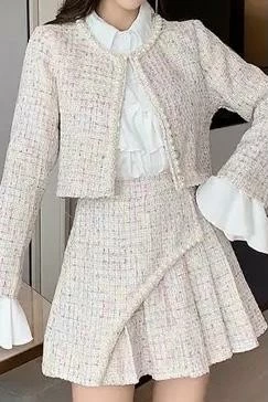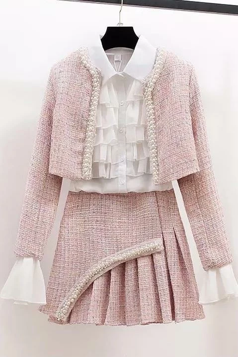 There’s nothing we love more than a matching set dolls. This three piece set features a long sleeve blouse with flared sleeves and a layered, ruffle bust, a long sleeve pink tweed jacket with pearl embellishing down the collar and center seam, and a matching high waisted, irregular cut pleated skirt. Pair this with a matching headband, big handbag, and loafers or boots for a complete boss babe look we love!