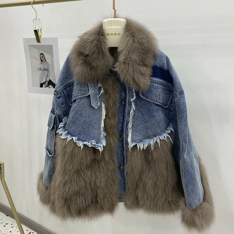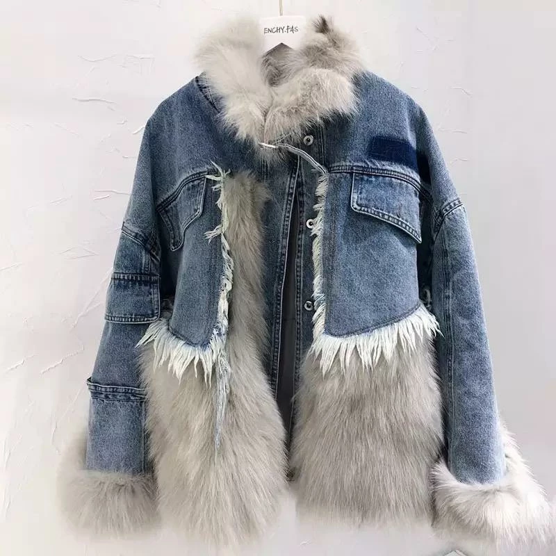 Never be cold this season with this super stylish jacket featuring a fur lined collar, cuff, and torso with a cropped distressed denim jacket sewn in. Throw over any outfit to become instantly stylish.