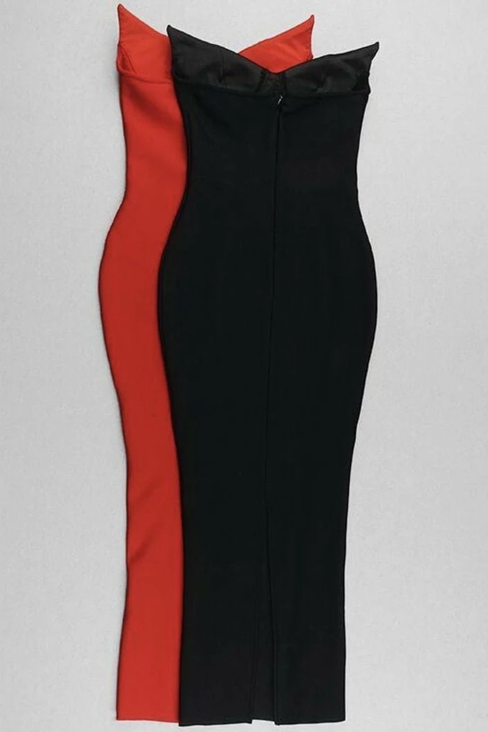 This strapless midi dress, available in red or black, features a sweetheart neckline with pointed tips. Add some drama to your night with the elegant detailing of the Selena Dress and your best accessories.