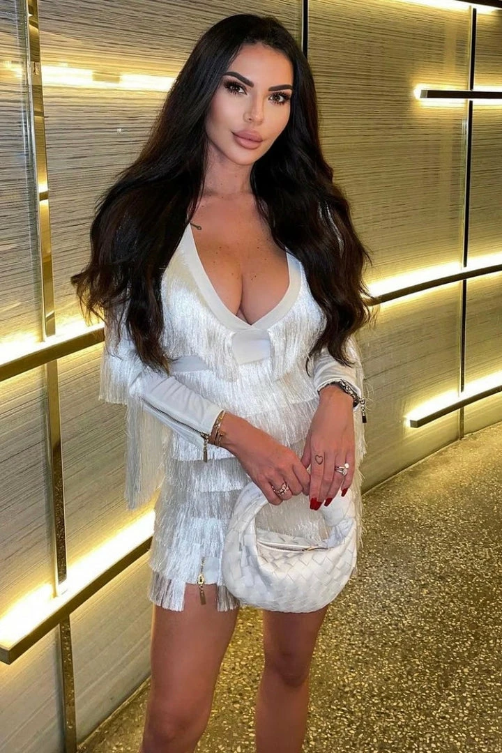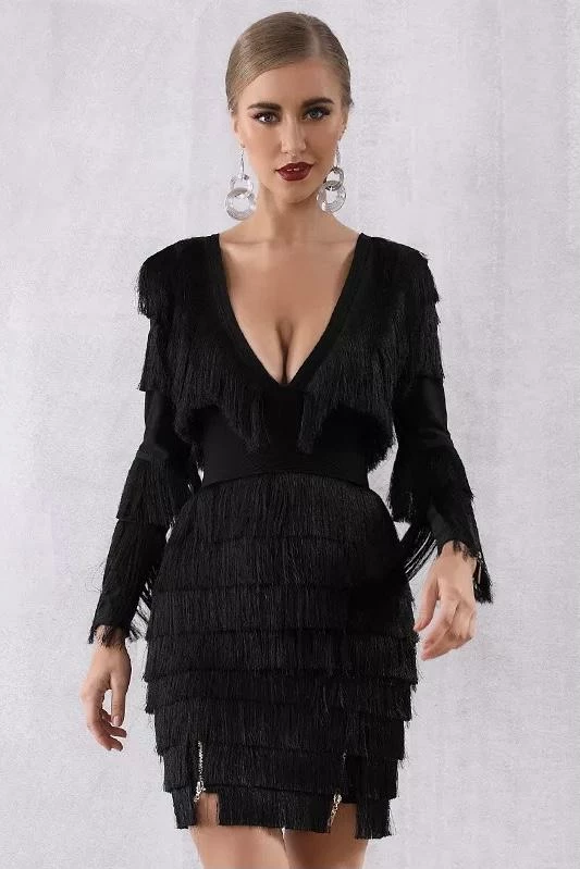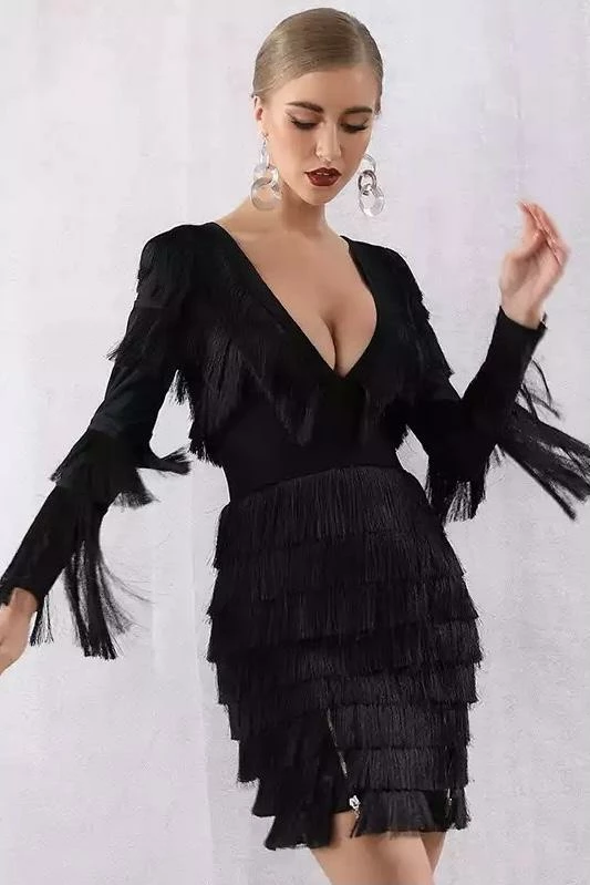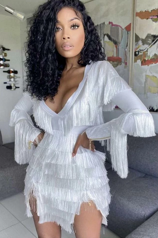 This piece will make you want to give a twirl! Featuring long sleeves, rows of tassel fringe layered throughout, two zipper leg slits, a deep v neck, and a mini length. Pair this with a simple pump and statement earrings for a look that’ll have you dancing the night away!