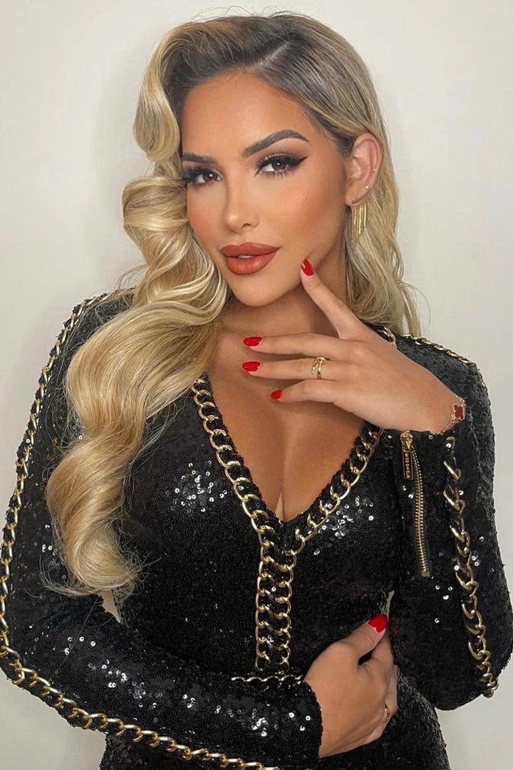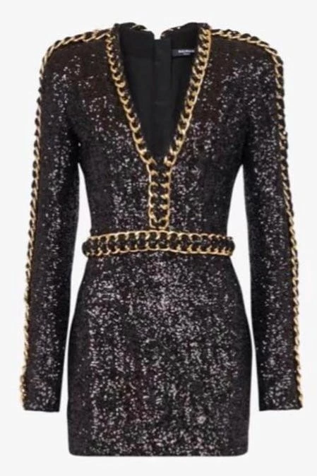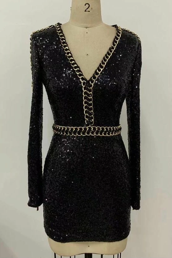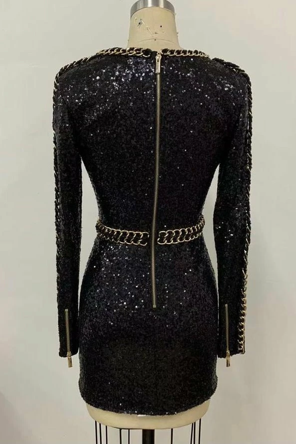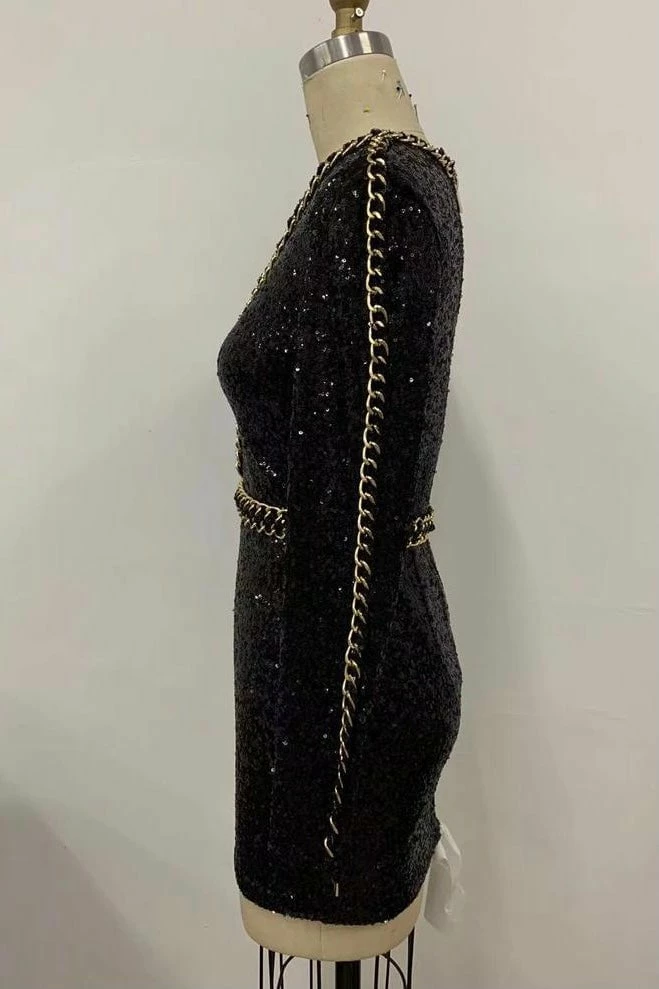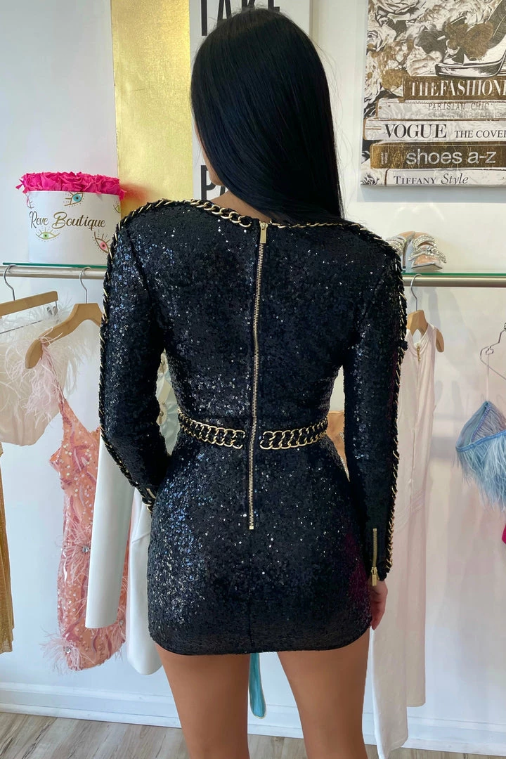 We’re little black dress lovin’! This mini features long sleeves, a fully sequin material, v neck, and gold chain details. Pair with gold hoops and black ankle strap heels for your next date night!