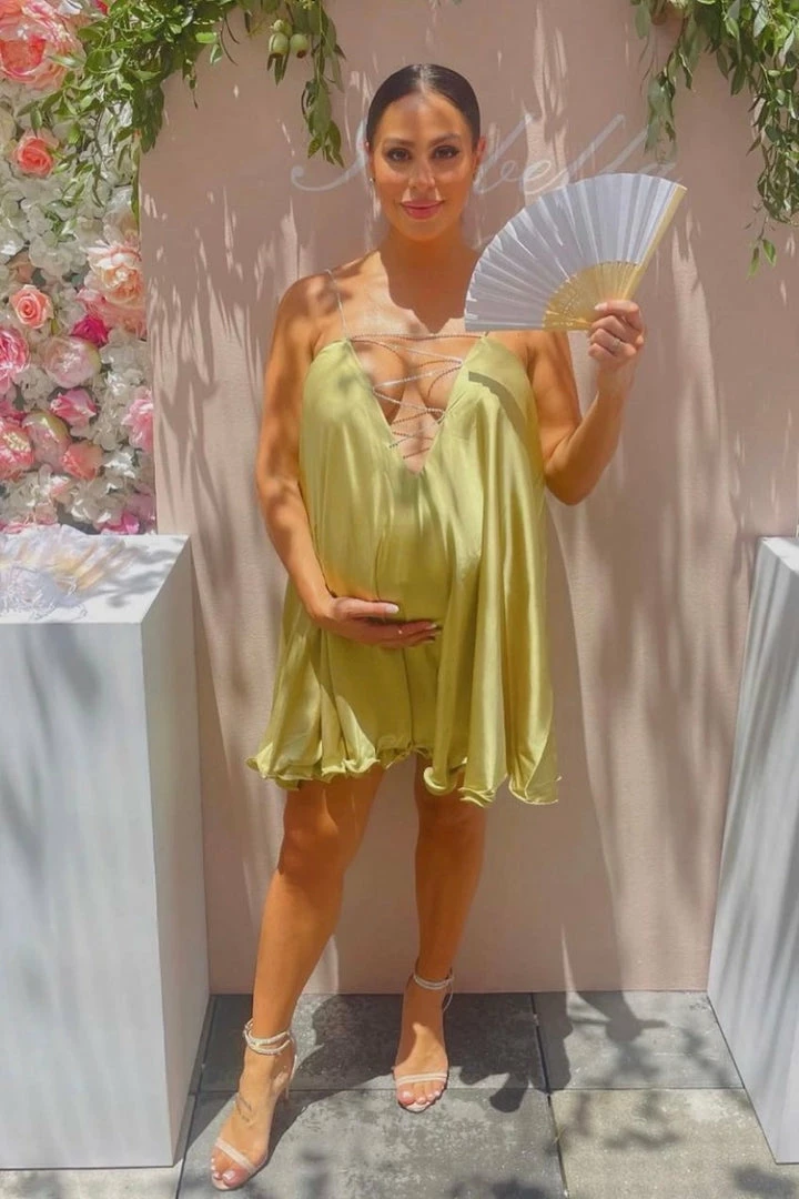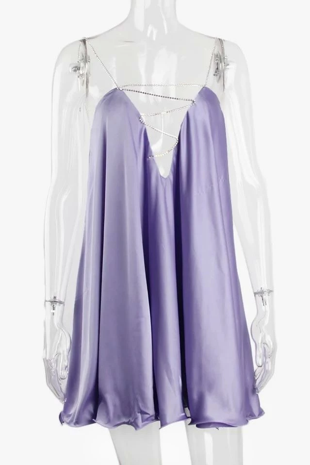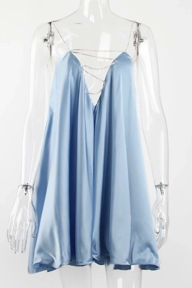 Twirl into your next event in this eye-catching mini dress with satin material, deep v neck, and iridescent crystal straps. Pair this with matching crystal shoes and a mini clutch for an outfit that will make you want to throw a party just to wear it!