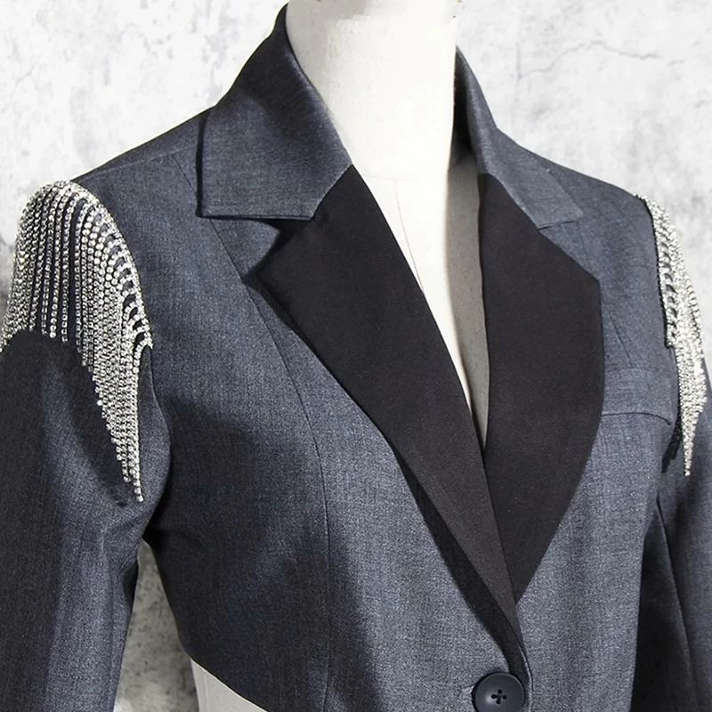 Take the blazer dress trend to the next level with this gorgeous piece. Featuring long sleeves, single breasted style, cut-outs on the waist, rhinestone fringe details on the shoulders, and mini length. Pair with stilettos and statement earrings.