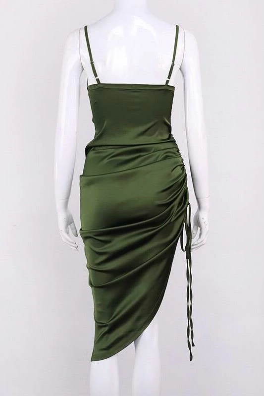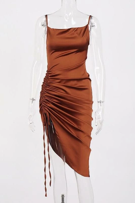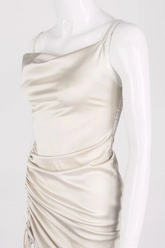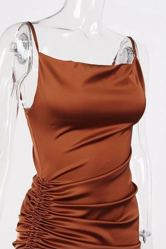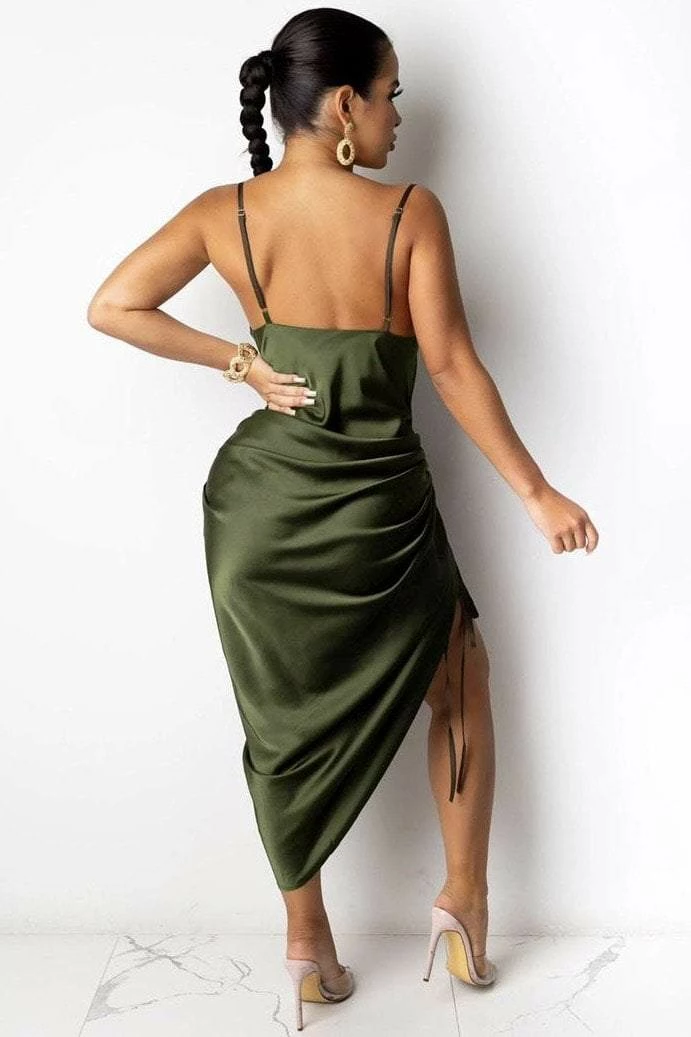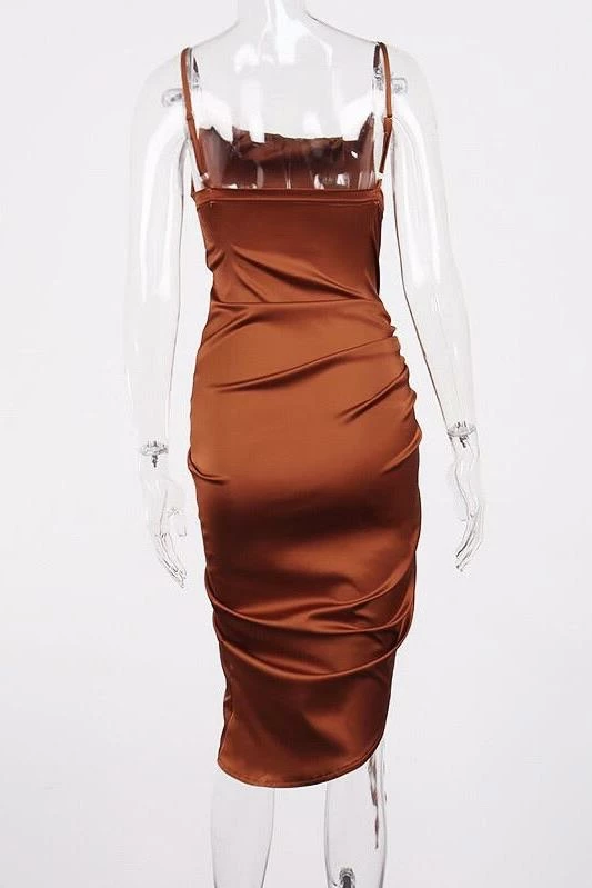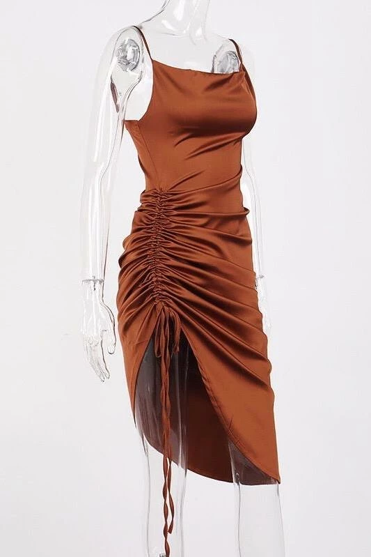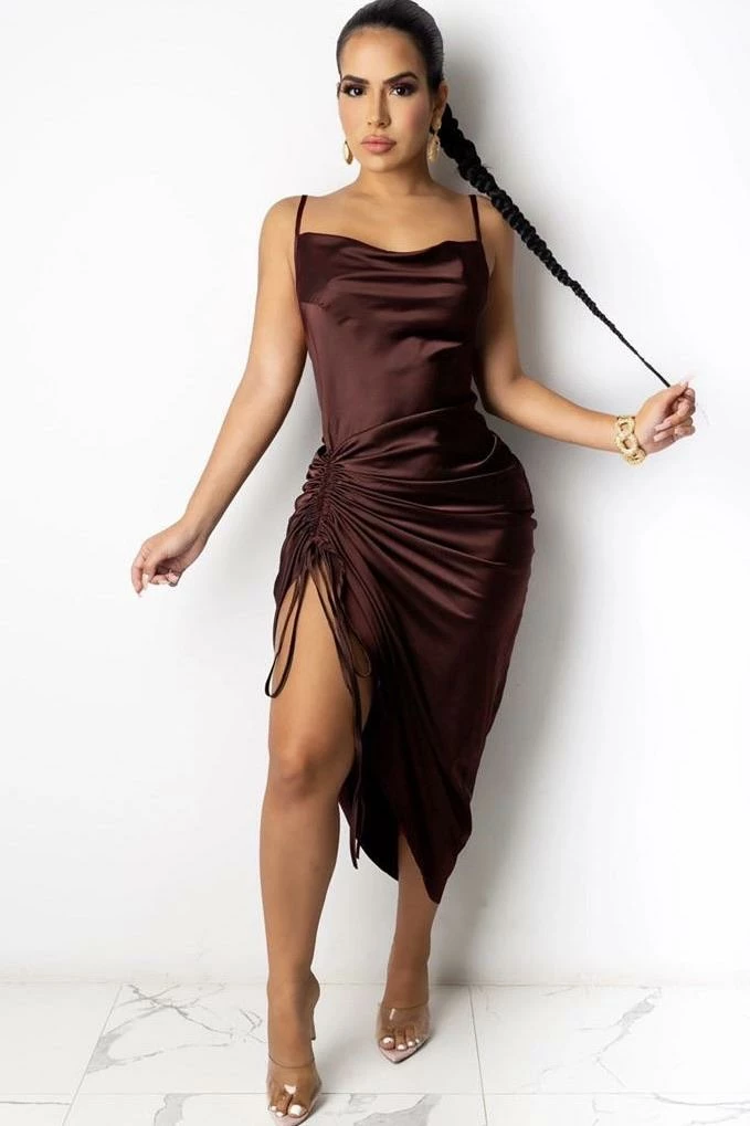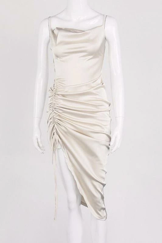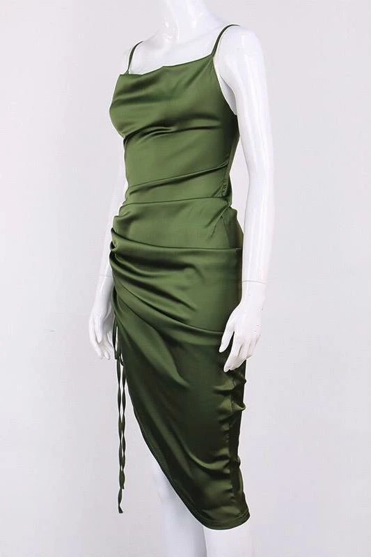 Take date night to the next level in this dreamy satin midi dress with ruched thigh detailing, a leg slit, thin straps, and a cowl neck. Pair this will clear heels and a dainty necklace to transform into a total goddess!