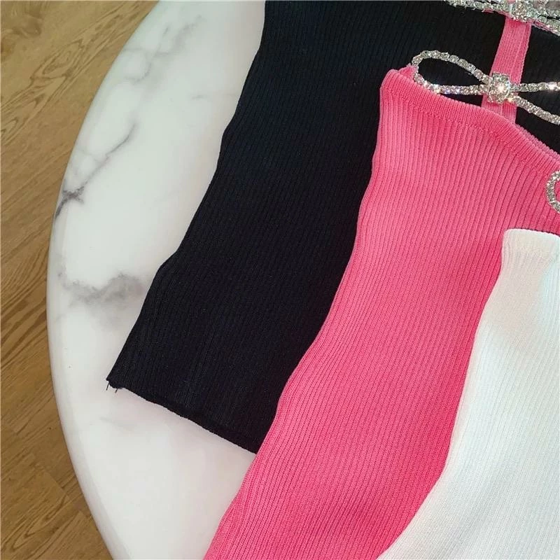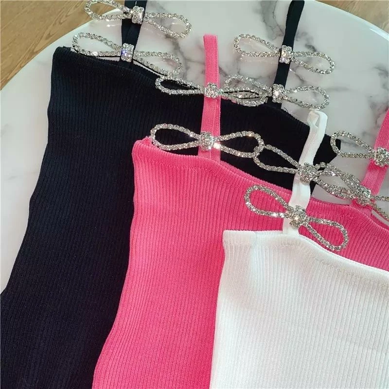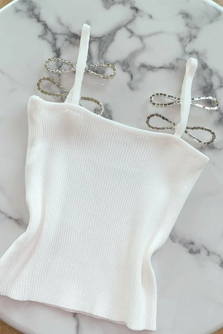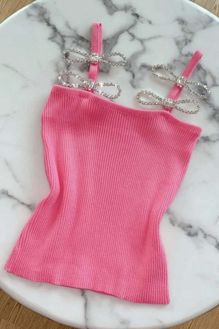 Add some glamour to your everyday basics with this cute tank! Featuring a knitted material, rhinestone bow details on the straps, and a slim fit.