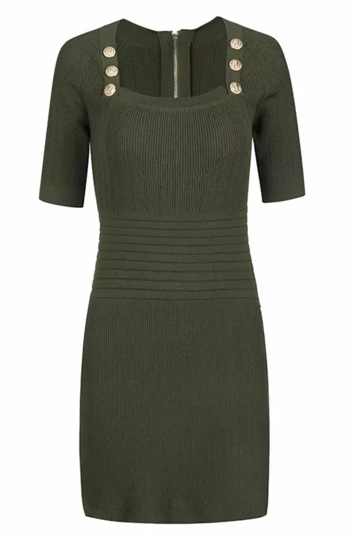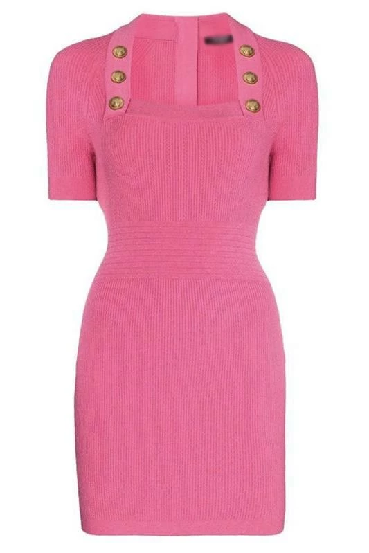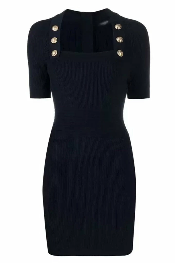 Serve total doll vibes in this adorable short sleeve, gold button, square neck, mini dress. Pair with clear heels, a handbag, and sunglasses to hit the town in style!