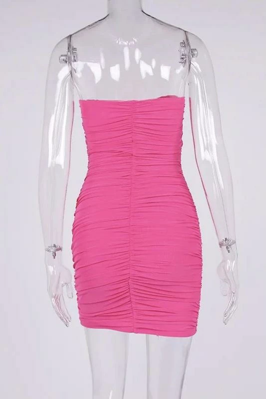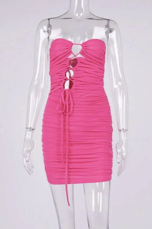 We’re obsessing over this bodycon mini dolls! Our “Sonya” dress features a strapless design, an asymmetrical, lace up detail, and a ruched bodycon effect. Pair this stunner with some lace up heels and a leather jacket to complete the look.