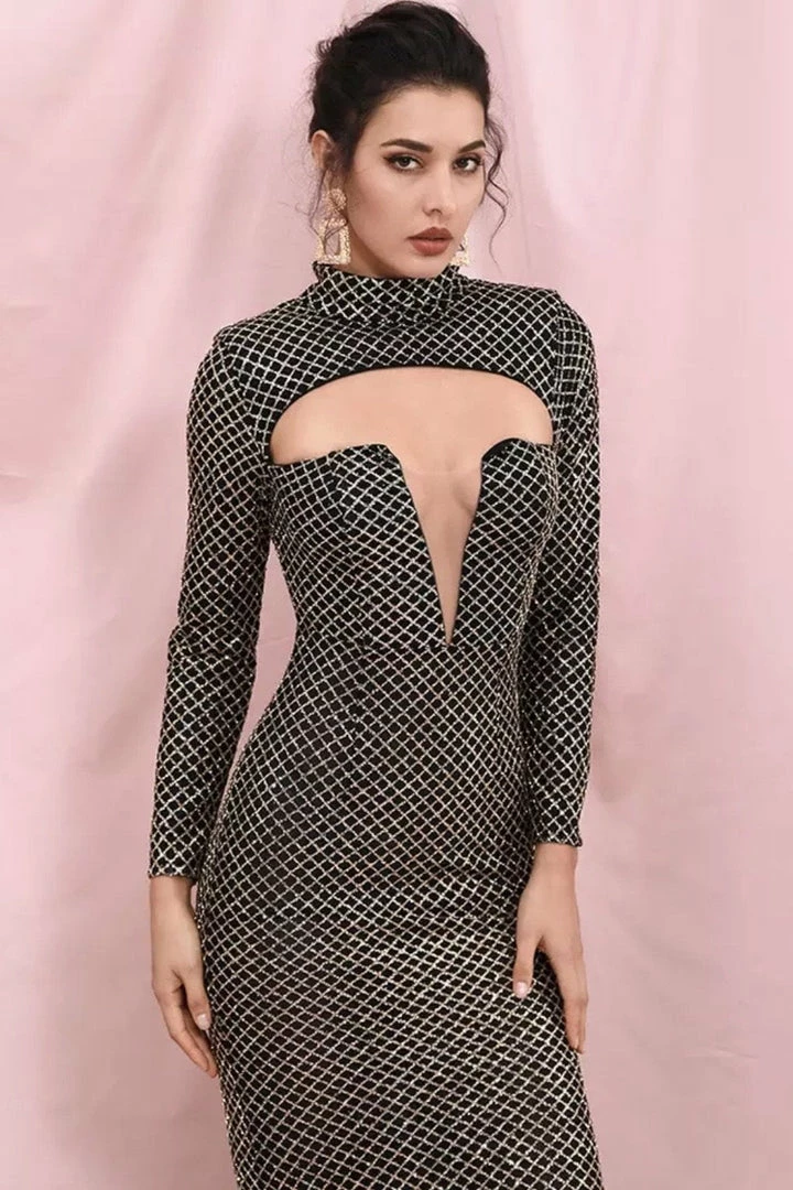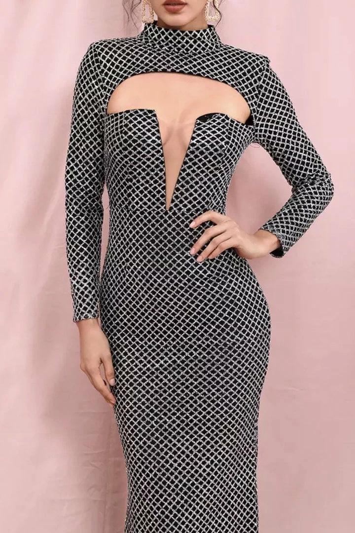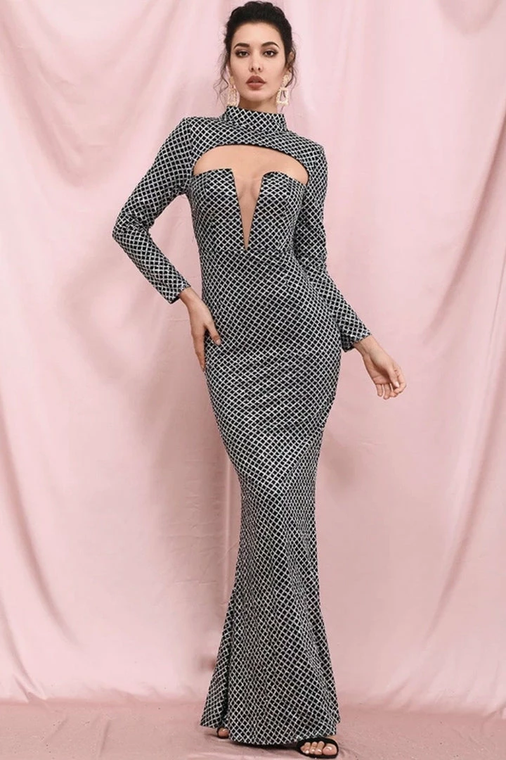 Stand out in the crowd in this gorgeous gown. Featuring a glitter material, cut-out detail, long sleeves, bodycon fit, and a floor length. Pair with statement earrings.