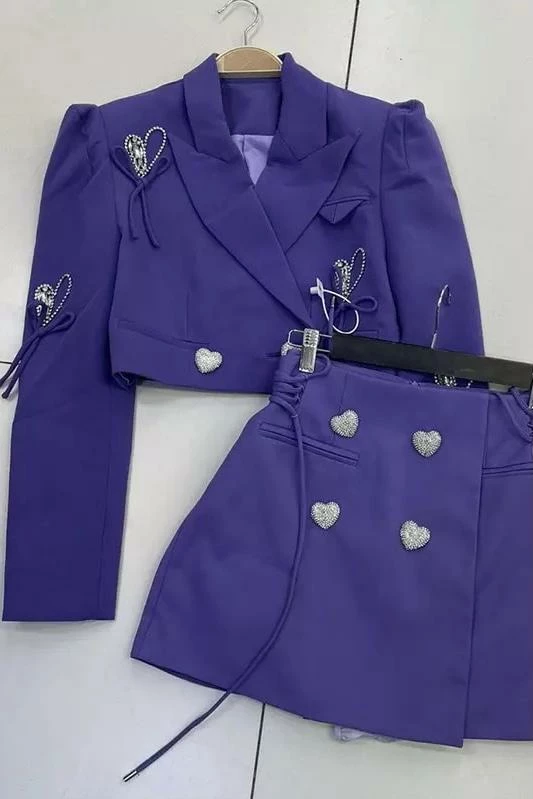 Hit all the style stops this season! Our ‘Steph’ two piece set features a long sleeve, double breasted cropped blazer with bowtie and crystal heart detailing and silver heart buttons. Set also includes a matching high waisted mini skort with built in shorts and lace up tie hip detailing. Whether it’s for a special birthday dinner or to show off with the girls, this set is the perfect match!