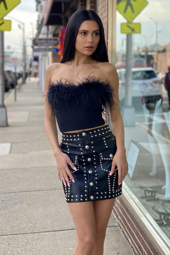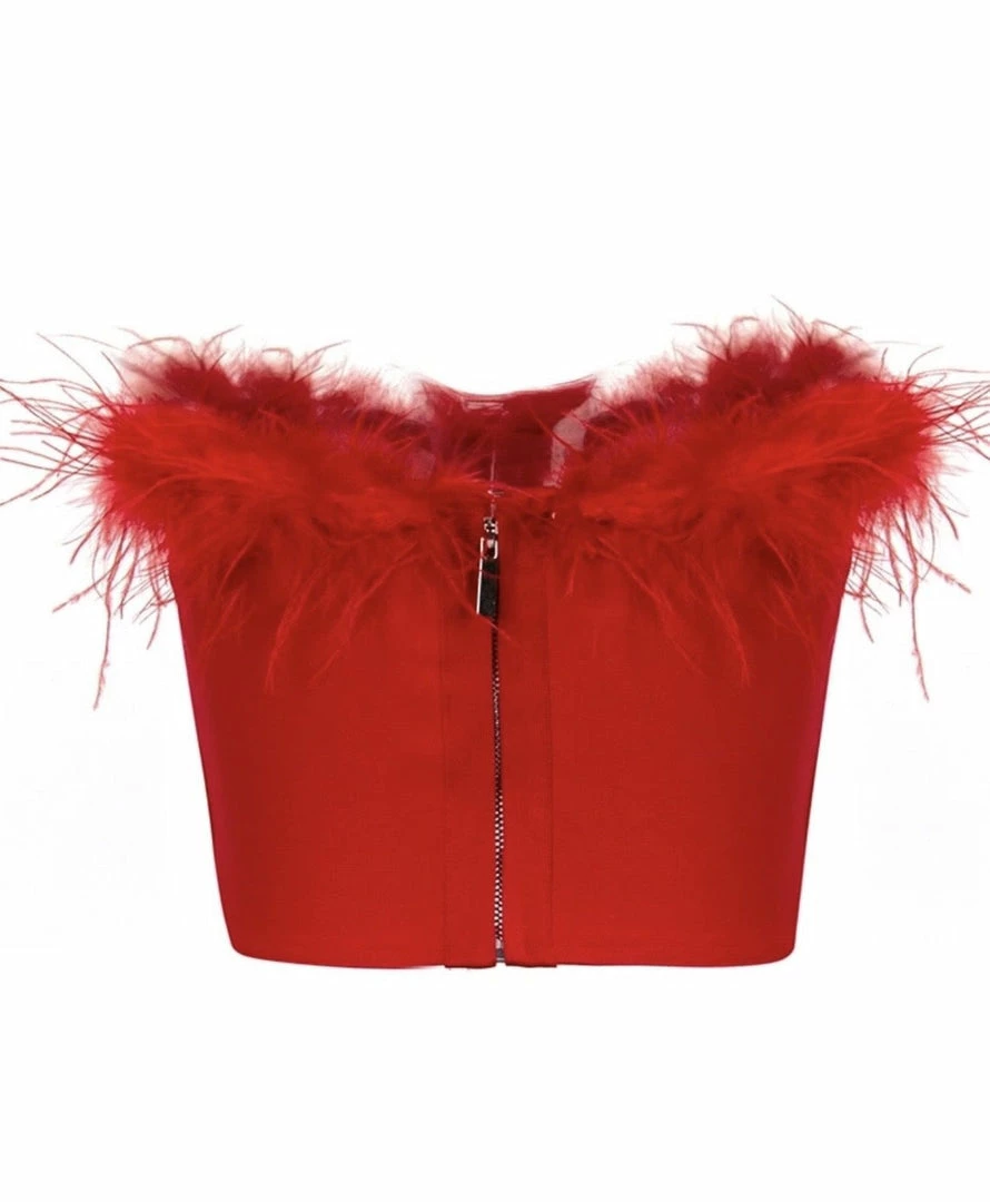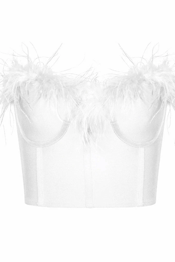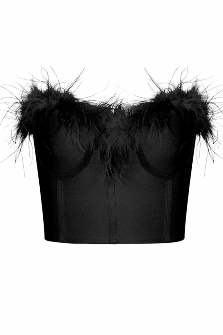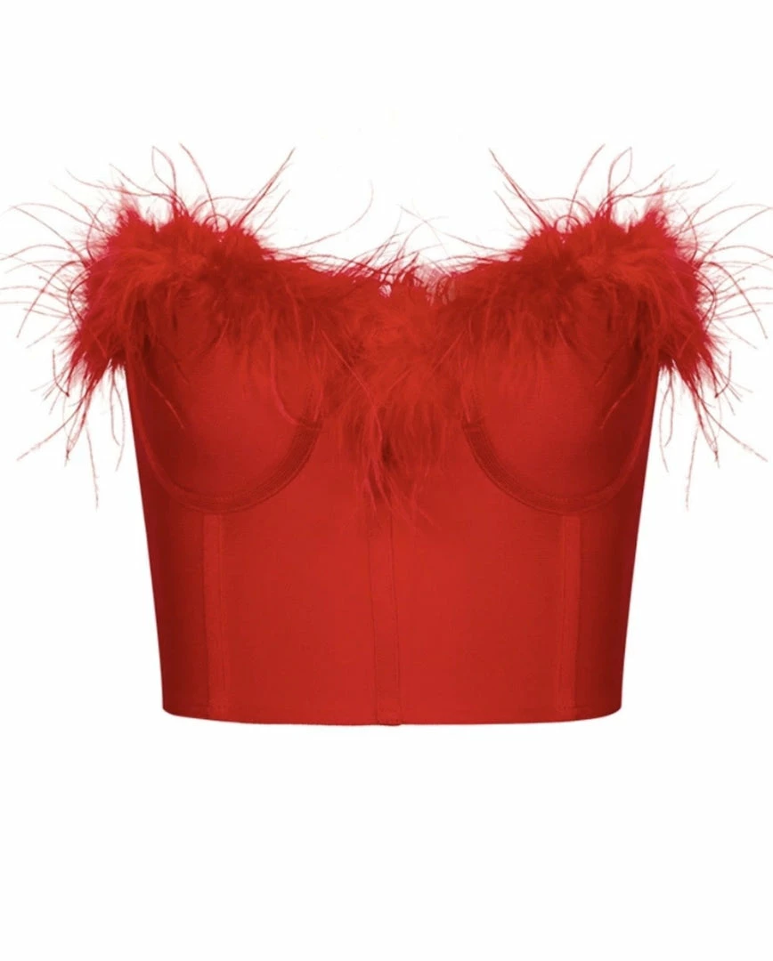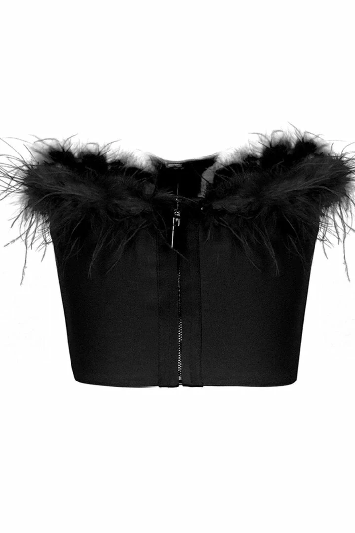 Add some fun back into your wardrobe with this crop top. Featuring a strapless fit, feather trim detail, bustier style, and cropped length. Pair with boyfriend jeans and ankle strap heels.