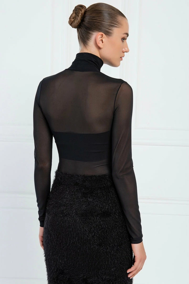 - Sheer mesh top featuring a stretch fit, turtleneck, and long sleeves
