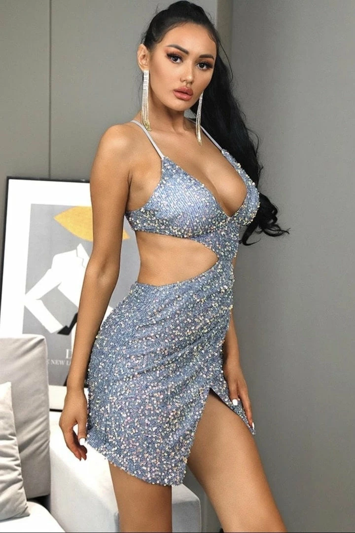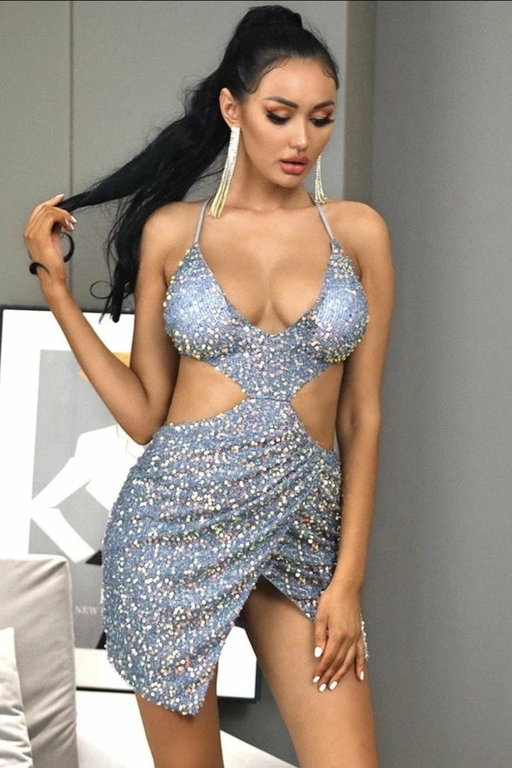 Get heads turning for all the right reasons in this sequin dress. Featuring a sequin material with cut out detailing, deep v neck, and a flattering fit. We love it teamed with strappy heels, a pastel-toned mini bag, and simple accessories.