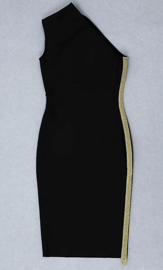 Simple, yet so sexy, our ‘Tempest’ dress will have all eyes on you! Featuring a one shoulder style, black material with gold stripe down the side, bodycon fit, and midi length. Pair with a high ponytail and booties for a night out!